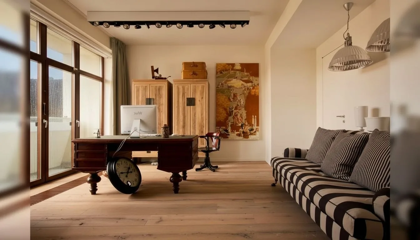 Центральным элементом кабинета становится массивный антикварный стол с характерным тёплым оттенком древесины. Он контрастирует с более современными элементами интерьера и добавляет пространству глубину. Вдоль стен установлены деревянные шкафы, которые не только выполняют функцию хранения, но и формируют завершённый образ рабочего пространства.