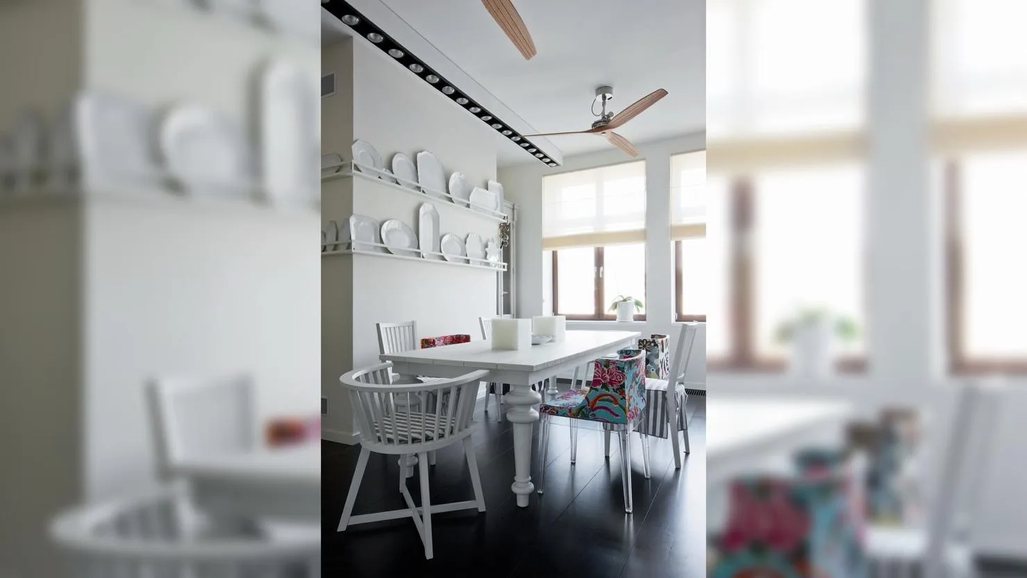 Мебель поддерживает выбранную концепцию. В гостиной располагается мягкая зона в тёмных тонах, напротив которой размещена обеденная группа в белом цвете. Такое противопоставление не выглядит случайным — оно формирует четкое зонирование без использования перегородок. Пространство остаётся открытым, но при этом каждая зона читается отдельно.