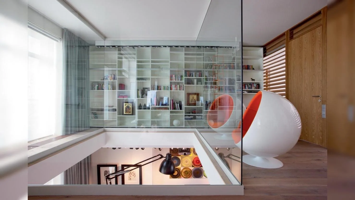 Одним из самых необычных элементов квартиры является архитектурный приём с вырезом в перекрытии между этажами. Это своего рода «второй свет», обрамлённый стеклянной перегородкой. Функциональной нагрузки он практически не несёт, однако играет важную роль в восприятии пространства. Благодаря этому решению квартира выглядит более объёмной, а свет свободно перемещается между уровнями.