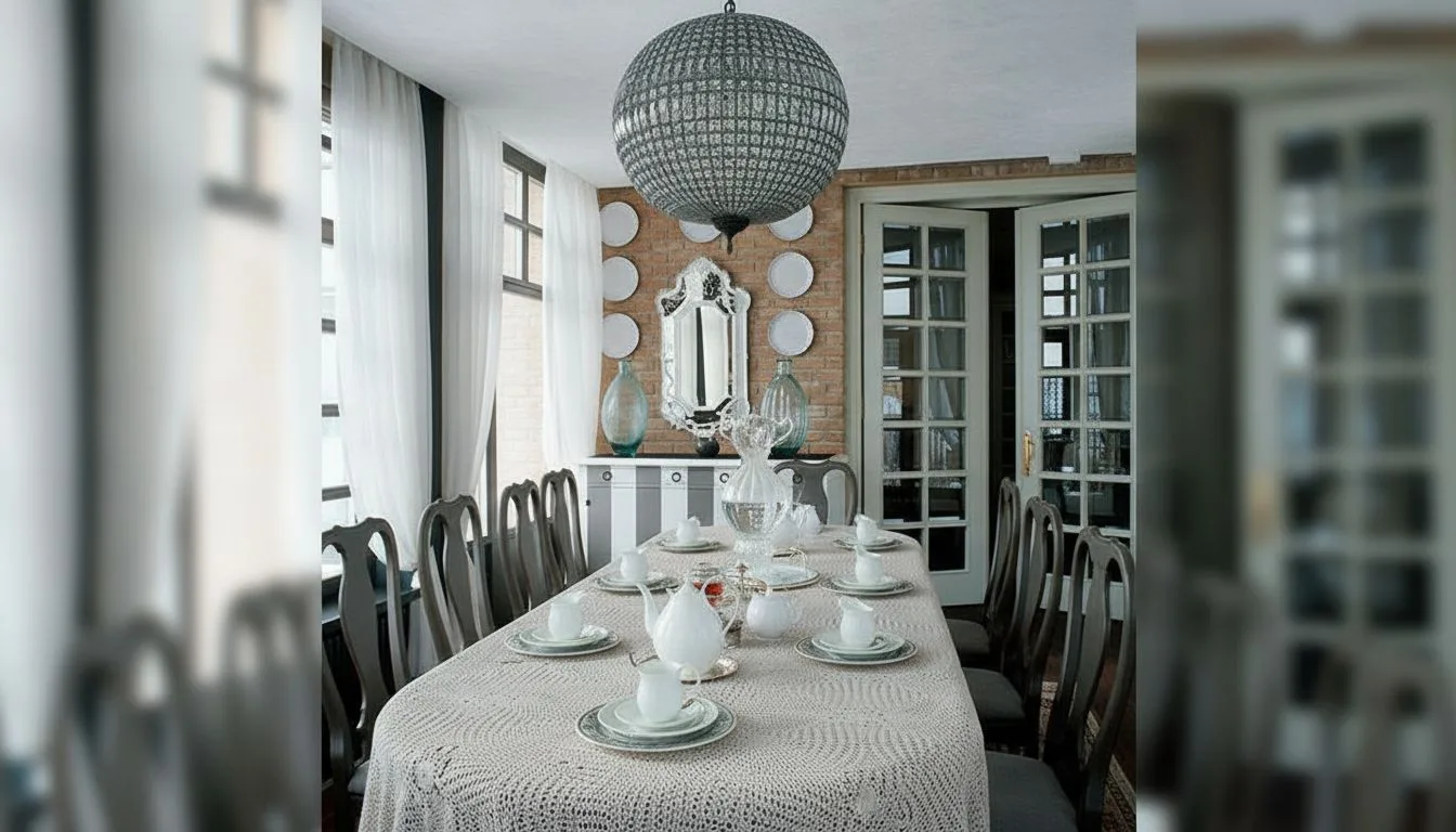 Кухня выделяется более традиционными элементами — стульями в чехлах, декоративными тарелками на стенах. Это придает помещению уют и отсылает к классическим приемам оформления, не разрушая общего современного настроения.