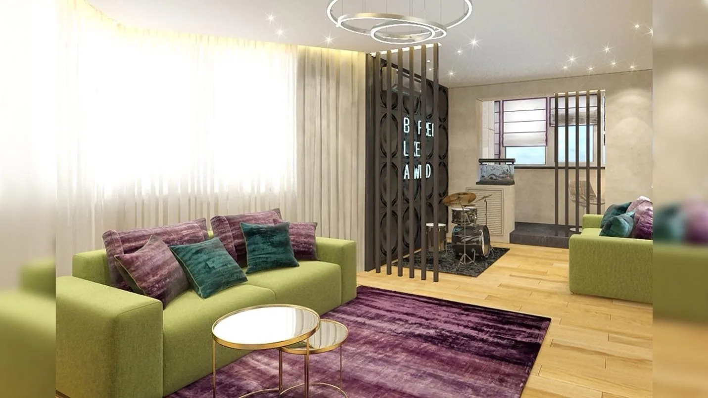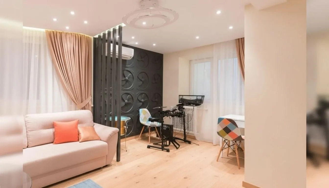 Интерьер выполнен в мягких, спокойных оттенках. Светлый диван, текстиль в пастельной гамме, качественный паркет — всё это формирует атмосферу уюта. При этом пространство не выглядит скучным: дизайнеры добавили акцентные элементы, которые придают интерьеру характер. Особое внимание уделено зонированию. Комната разделена на несколько функциональных частей: зона отдыха, рабочее пространство и место для хобби. Для сына оборудована отдельная часть комнаты, где он может заниматься и проводить время с друзьями. Здесь же размещена электронная ударная установка — важный элемент, который требовал продуманной интеграции в интерьер.