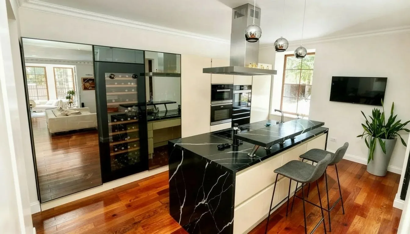 Кухня выполнена в угловой конфигурации, что позволяет эффективно использовать площадь. Кварцевая столешница, плитка, уложенная по диагонали, и продуманная цветовая гамма формируют визуально цельное пространство. Отдельно выделена зона отдыха у окна — решение, которое всё чаще встречается в современных проектах и позволяет расширить функционал кухни.
