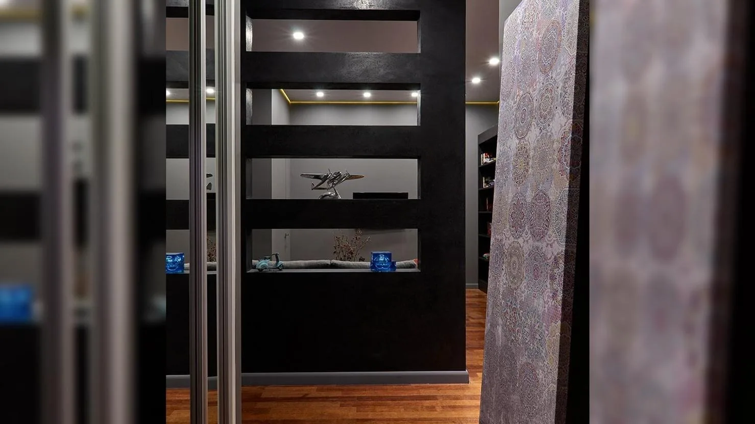Пол украшает ковёр с геометрическим рисунком. Он выполняет сразу две функции: визуально выделяет рабочую зону и служит акцентом в сдержанном пространстве.