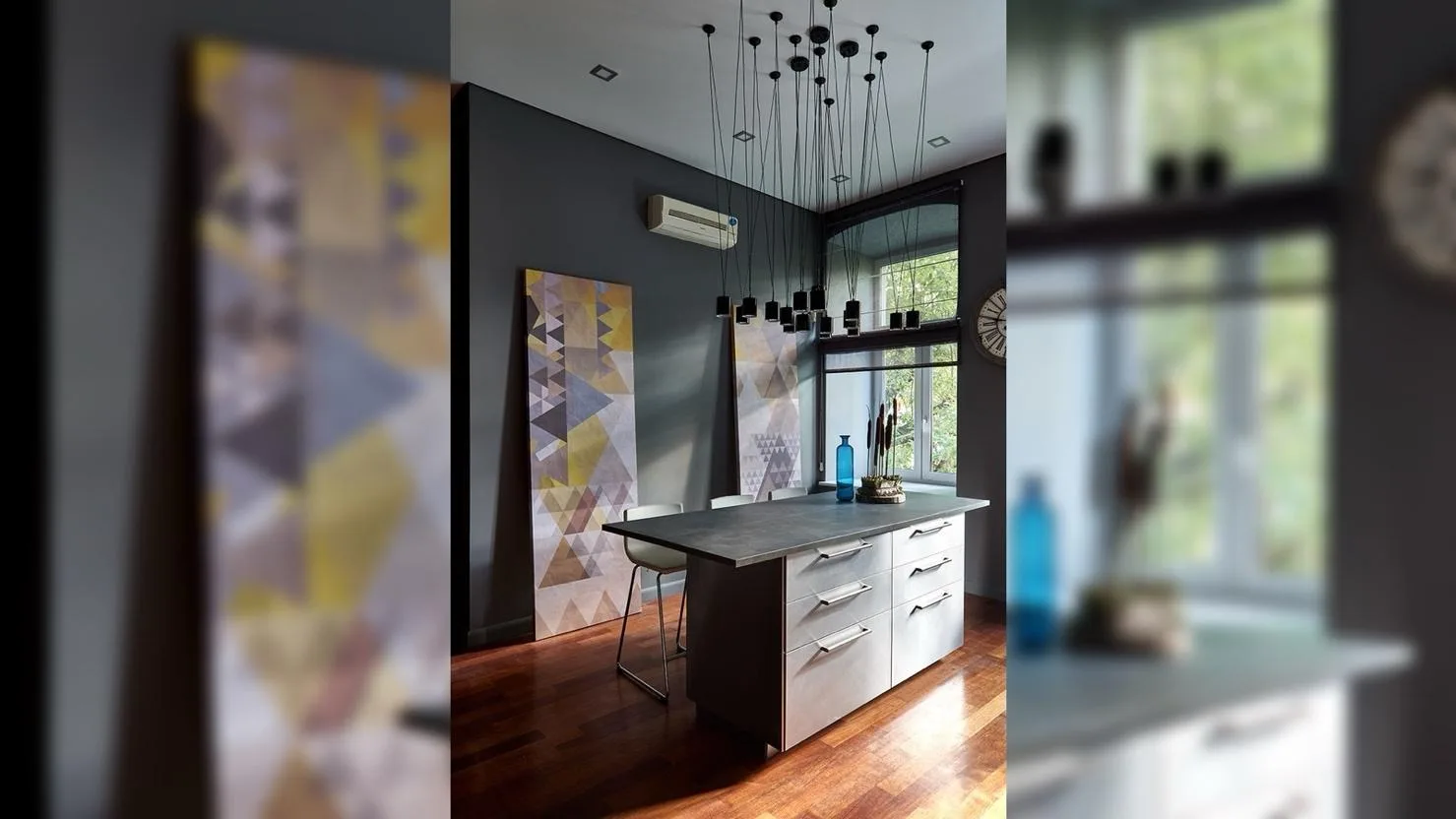 Корпусная мебель и стол выполнены из МДФ и выступают самостоятельными визуальными акцентами. Их строгие формы подчёркивают современный характер интерьера, а отсутствие лишнего декора создаёт ощущение порядка.