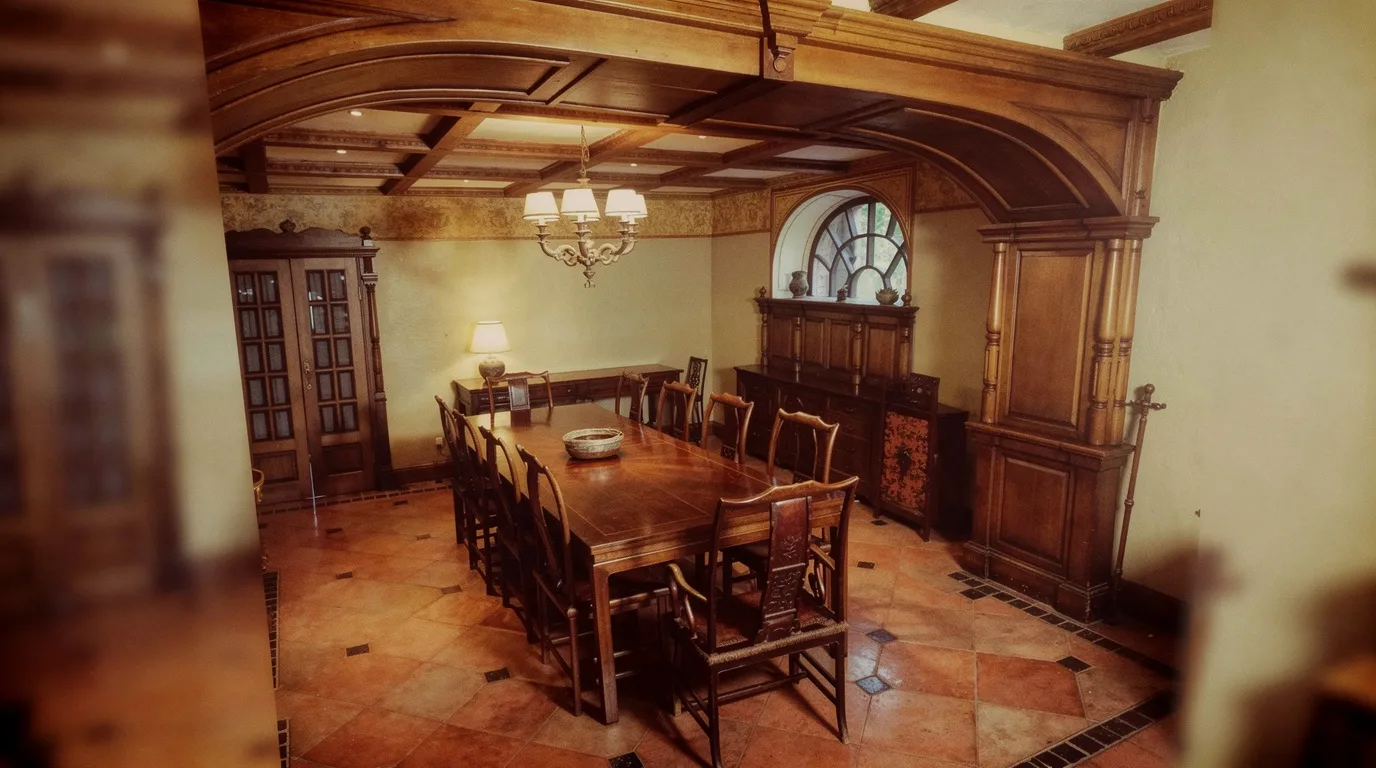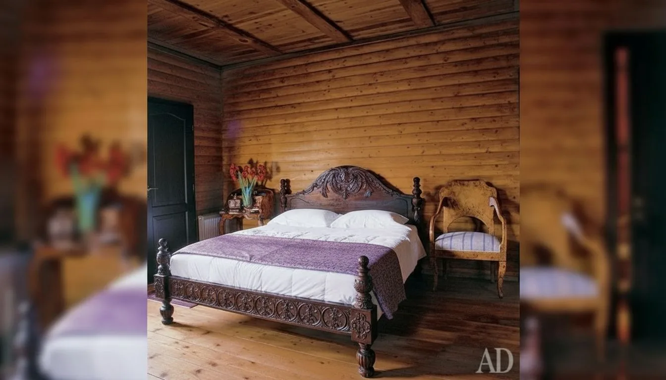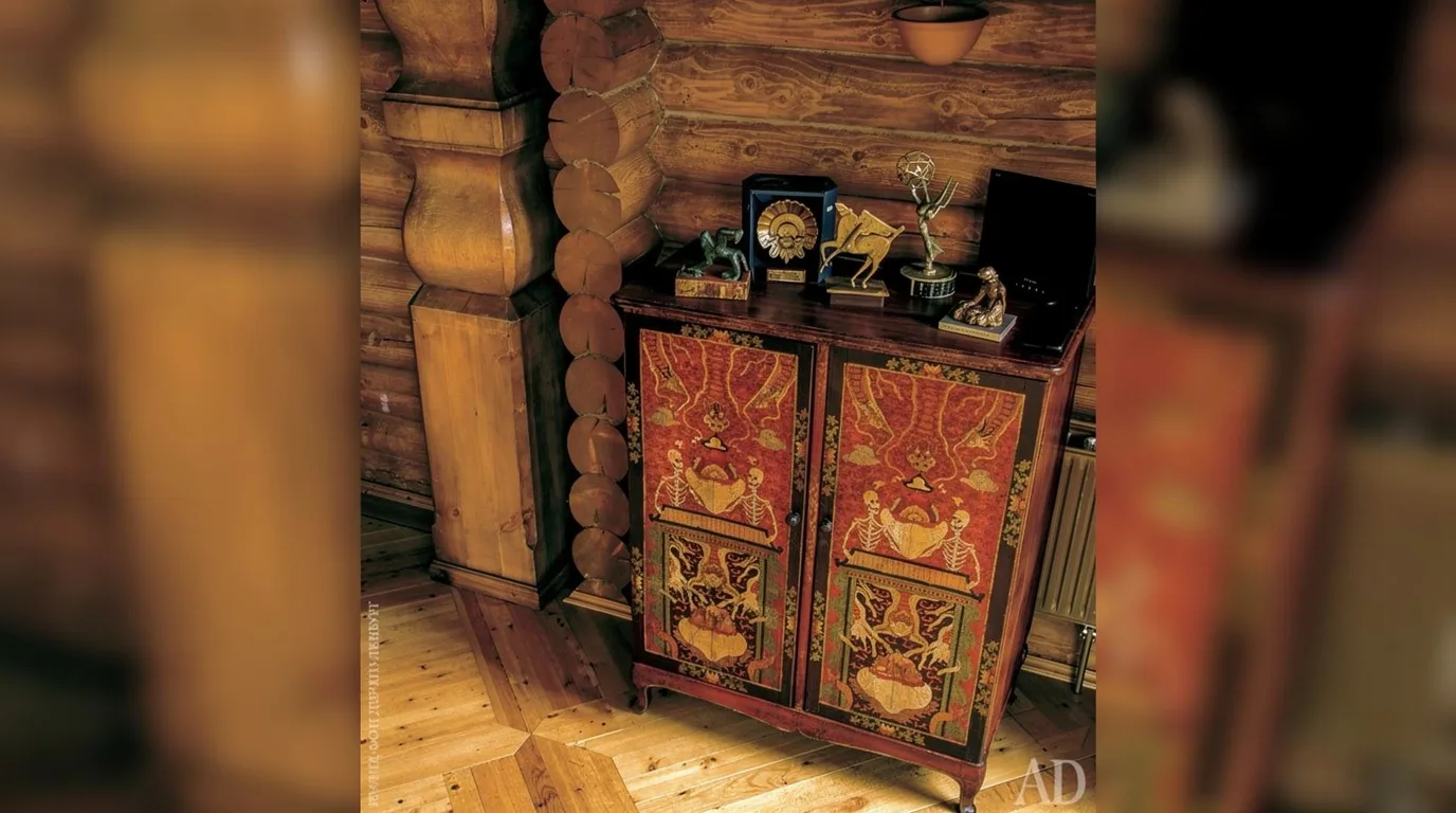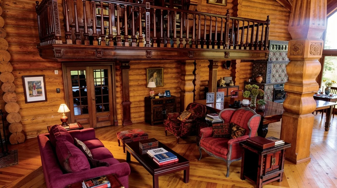 Архитектурная концепция дома также далека от стандартов. Кончаловский сознательно отказался от идеи «чистого» стиля. Вместо этого он выбрал путь сложной, многослойной композиции, которую сам сравнивает с традиционными русскими теремами. Дом словно собран из разных объёмов: крыши, уровни, углы — всё это создаёт ощущение динамики и живости. С инженерной точки зрения проект оказался непростым. Например, большое панорамное окно в гостиной, занимающее практически всю стену, потребовало сложных расчётов — типичная бревенчатая конструкция просто не выдержала бы такой нагрузки. Резные колонны, выполненные белорусскими мастерами, выполняют не только декоративную функцию, но и несут на себе часть конструктивной нагрузки. Работа над проектом велась совместно с архитектором Любовью Скориной. Их сотрудничество началось еще на «Мосфильме», где Скорина занималась созданием декораций. Этот опыт оказался важным: дом действительно воспринимается как тщательно продуманная сценография, где каждая деталь имеет свое место и значение. При этом здание остаётся полностью современным с точки зрения инженерии. Например, в доме реализована система тёплых полов, обеспечивающая комфорт в любое время года. Таким образом, историческая эстетика сочетается с актуальными технологическими решениями.