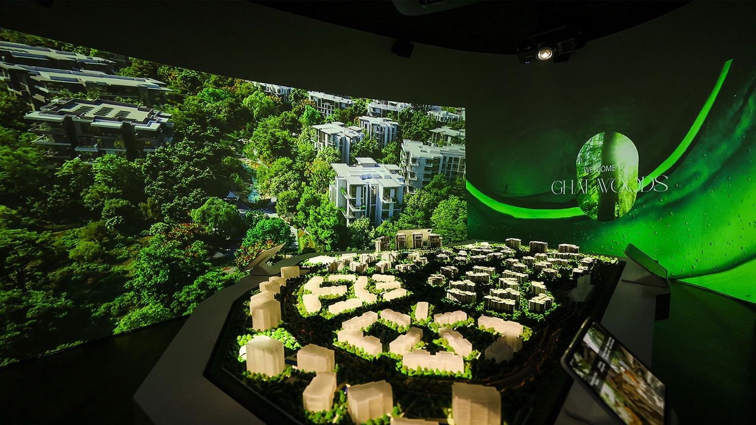 В центральной части здания размещена детализированная 3D-модель генерального плана Ghaf Woods, позволяющая оценить масштаб и логику будущего района. Рядом расположены интерактивные стенды с материалами и технологиями, которые будут использованы в жилой застройке.