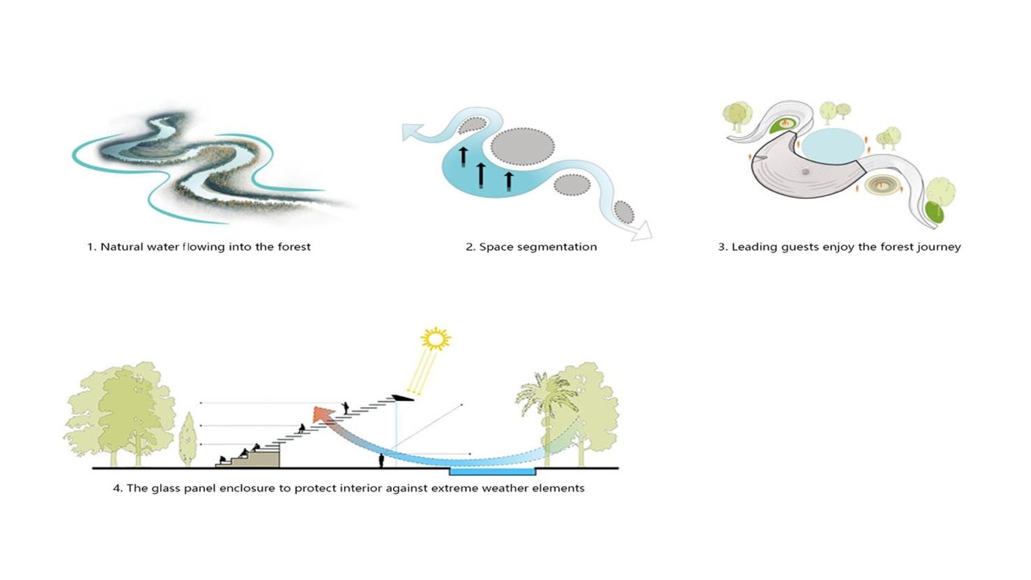 В основу концепции положена идея интеграции местных и устойчивых видов растительности, способных формировать тень, удерживать влагу и понижать температуру воздуха. Таким образом, лес здесь становится не декоративным элементом, а ключевым климатическим инструментом, влияющим на микросреду всего района.