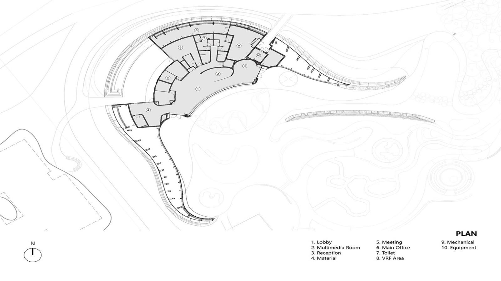 Искусственный пруд, расположенный с южной стороны, работает как элемент пассивного охлаждения: испарение воды снижает температуру окружающего воздуха, улучшая микроклимат не только внутри здания, но и на прилегающей территории.