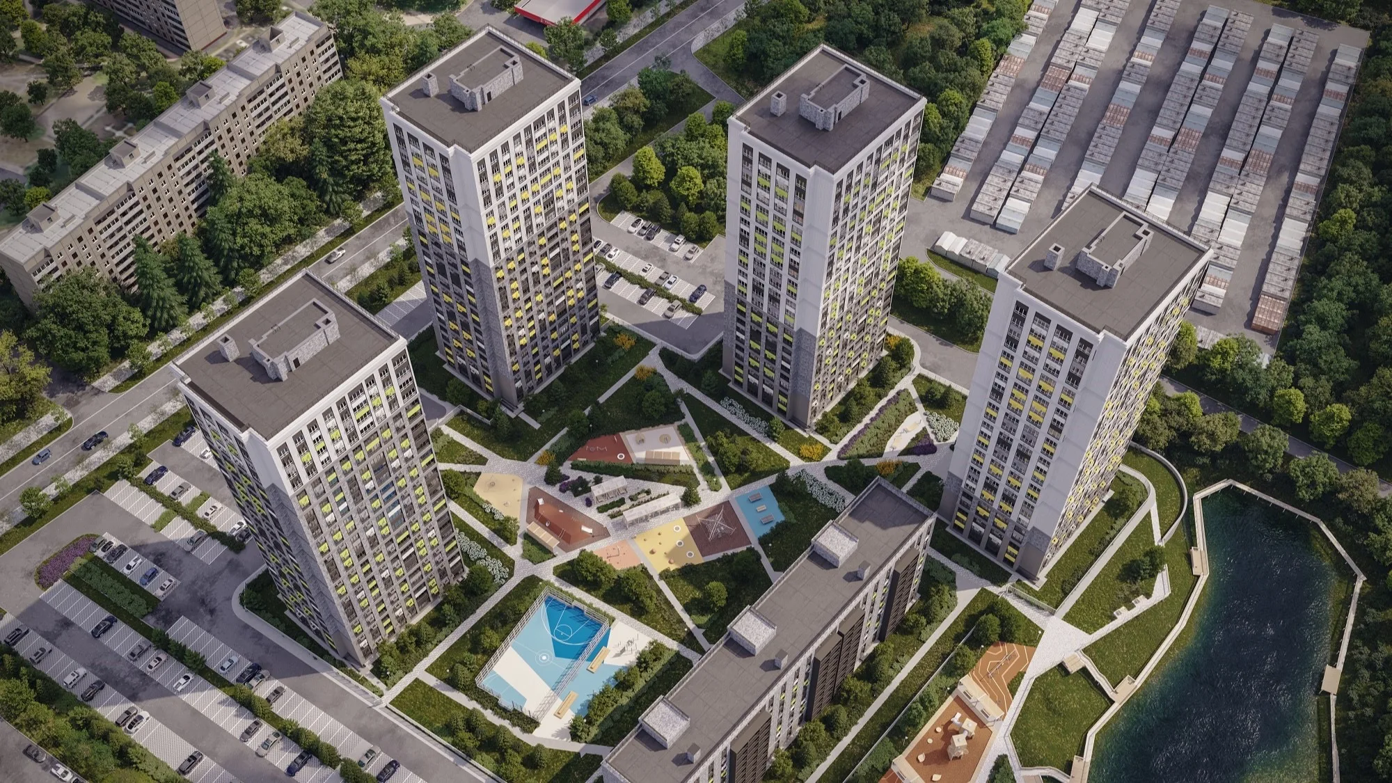 Внутри квартала предусмотрена сопутствующая инфраструктура: два детских сада, закрытые дворы, пешеходные маршруты и общественные пространства.