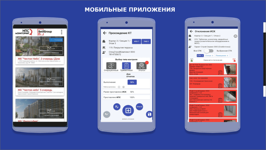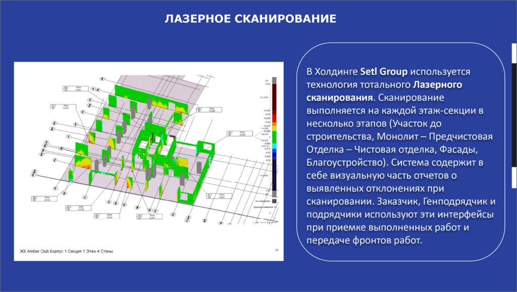 Кроме того, в Холдинге Setl Group используют технологию тотального лазерного сканирования, которое выполняется на каждой этаж-секции в несколько этапов. Система содержит в себе визуальную часть отчетов о выявленных отклонениях при сканировании. Заказчик, Генподрядчик и подрядчики используют эти интерфейсы при приемке выполненных работ и передаче фронтов работ.