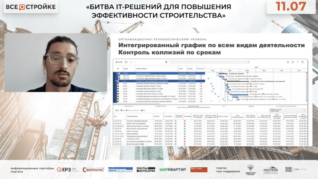 Никита Меньшиков, в свою очередь, рассказал о том, как с ведомостью объёма работ, которые были получены на платформе Larix, можно работать в Plan-R – интегрированном графике, где можно проследить всю цепочку выполненных работ.