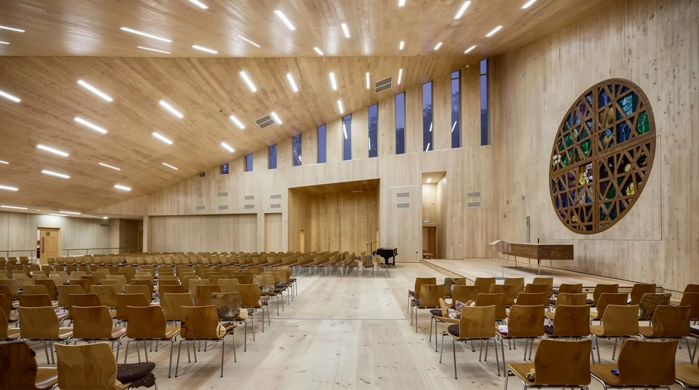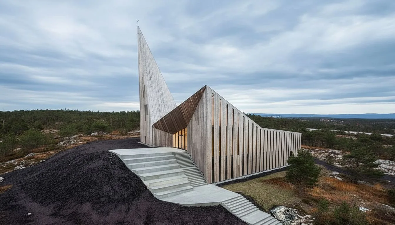 Церковь выглядит как звезда или кристалл. Проект разработан студией Reiulf Ramstad. Здание построено из дерева и вписано в ландшафт. Острые формы создают динамику. Архитектура переосмысливает традиционные каноны. Интерьер наполнен светом. Здание кажется легким, несмотря на сложную геометрию. Это пример современной сакральной архитектуры. Объект гармонирует с природой. И выглядит как объект будущего.