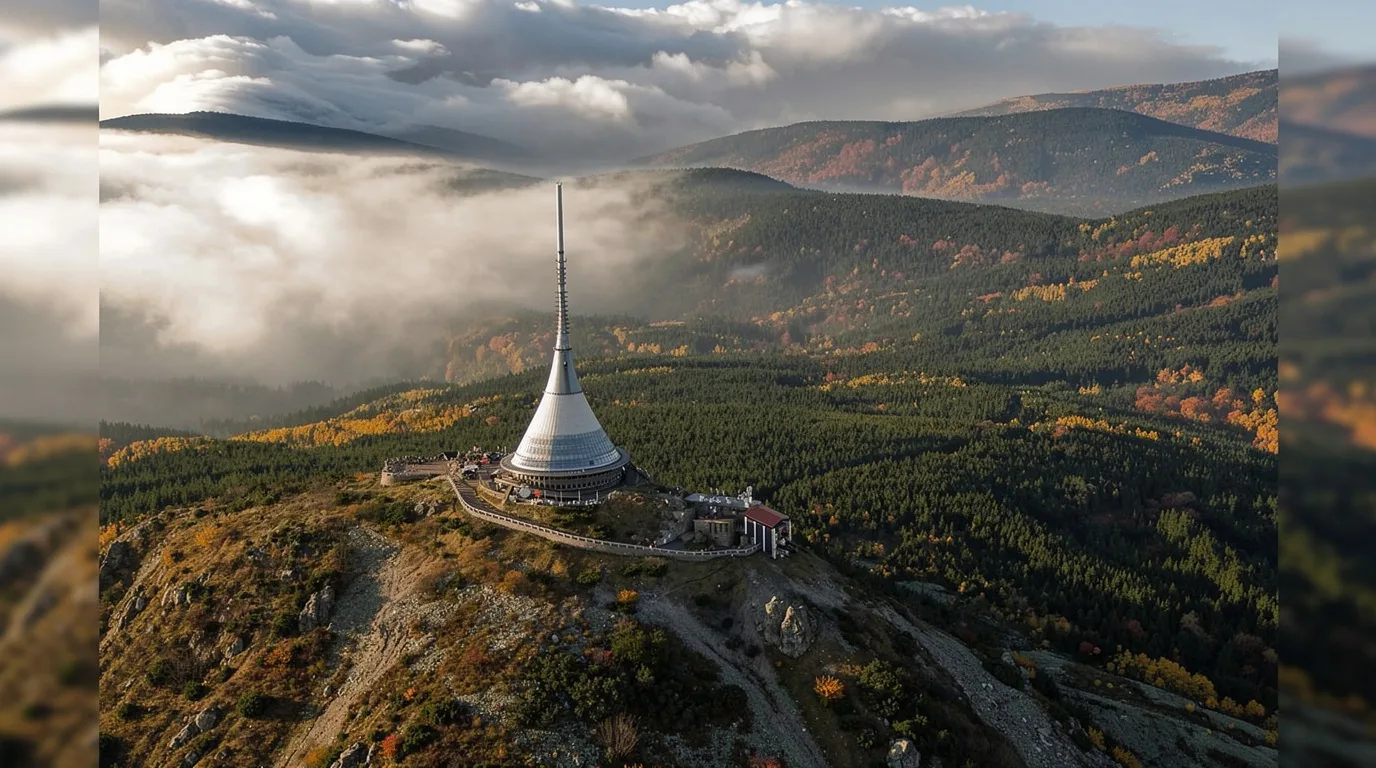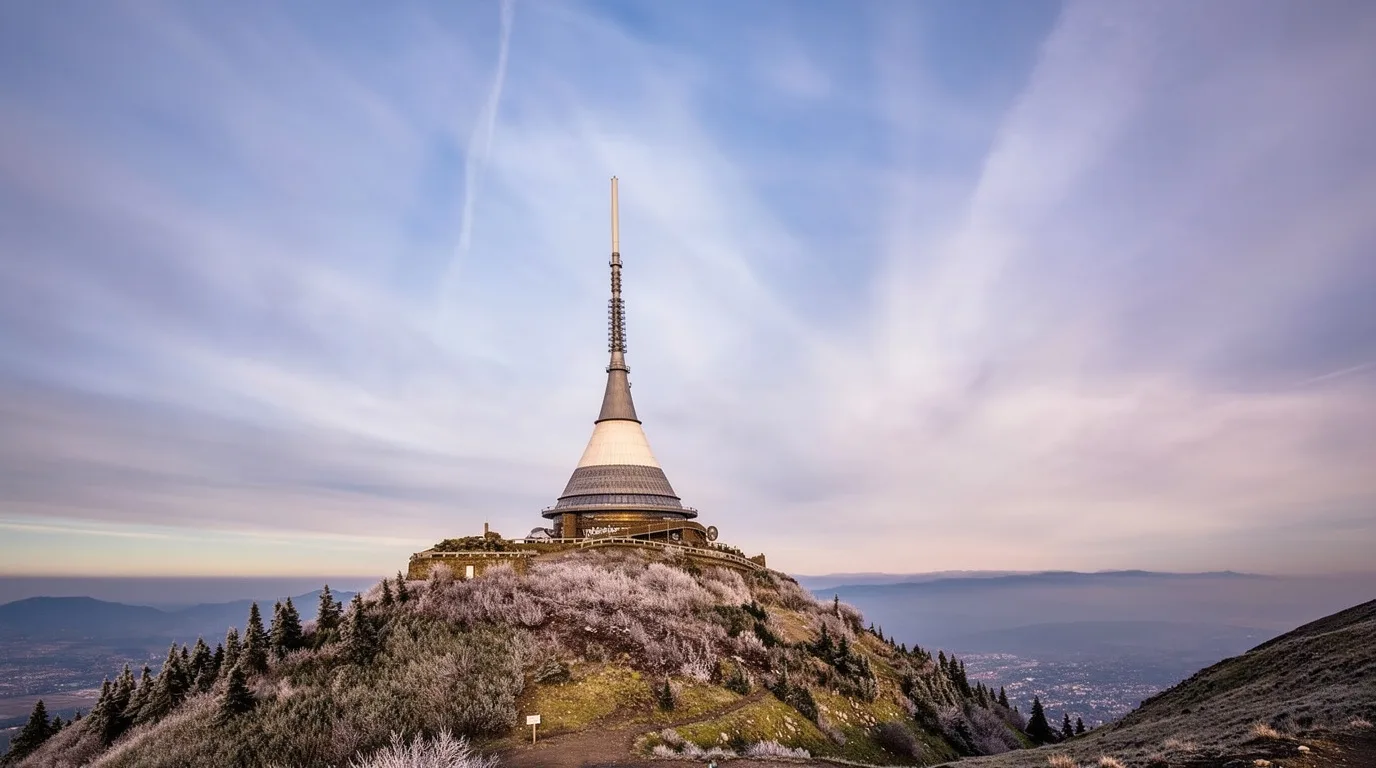 Этот уникальный объект совмещает в себе телебашню, отель и ресторан, что само по себе является инженерным вызовом. Здание расположено на вершине горы, что усиливает его визуальный эффект и делает его похожим на посадочный модуль. Архитектор Карел Губачек создал форму, которая словно вырастает из рельефа. Строительство велось в период активного увлечения космосом, что напрямую повлияло на облик башни. Высота сооружения составляет почти сто метров, и оно видно издалека. Внутренние интерьеры продолжают тему будущего — иллюминаторы, мягкие формы и необычная мебель. Посетители буквально погружаются в атмосферу научной фантастики. Конструкция сочетает бетон и современные на тот момент инженерные решения. Здание стало символом региона и важным туристическим объектом. Сегодня оно воспринимается как классика футуристической архитектуры.