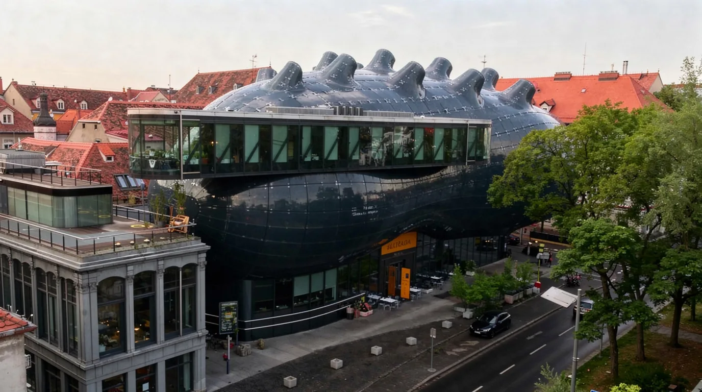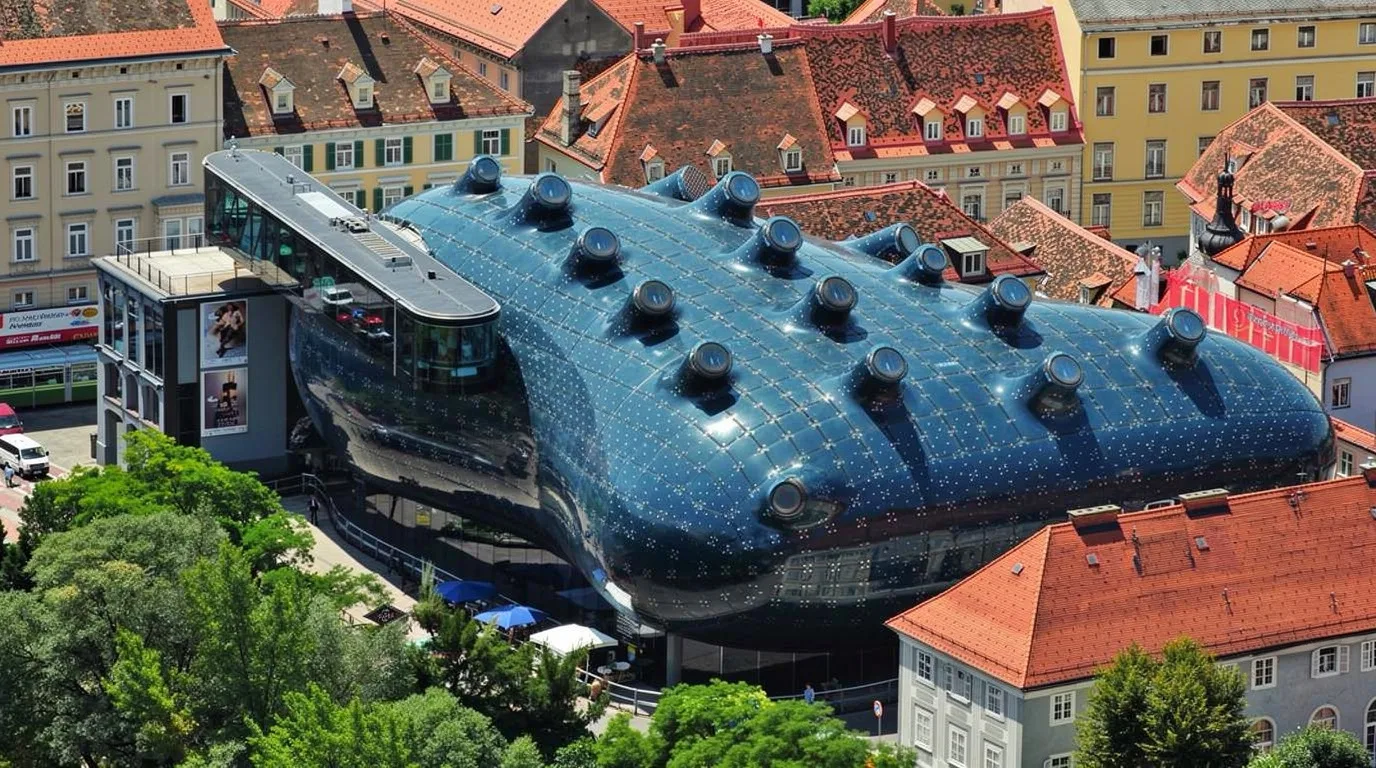 Этот музей называют «дружелюбным пришельцем». Проект создан архитекторами Питером Куком и Колин Фурнье. Здание выполнено в стиле blobitecture (блобитектура). Его оболочка состоит из современных материалов с технологичными элементами. Фасад может менять визуальное содержание. Форма напоминает живой организм. Внутри расположены выставочные пространства. Здание стало новой доминантой города, и это пример цифровой архитектуры, один из символов XXI века.
