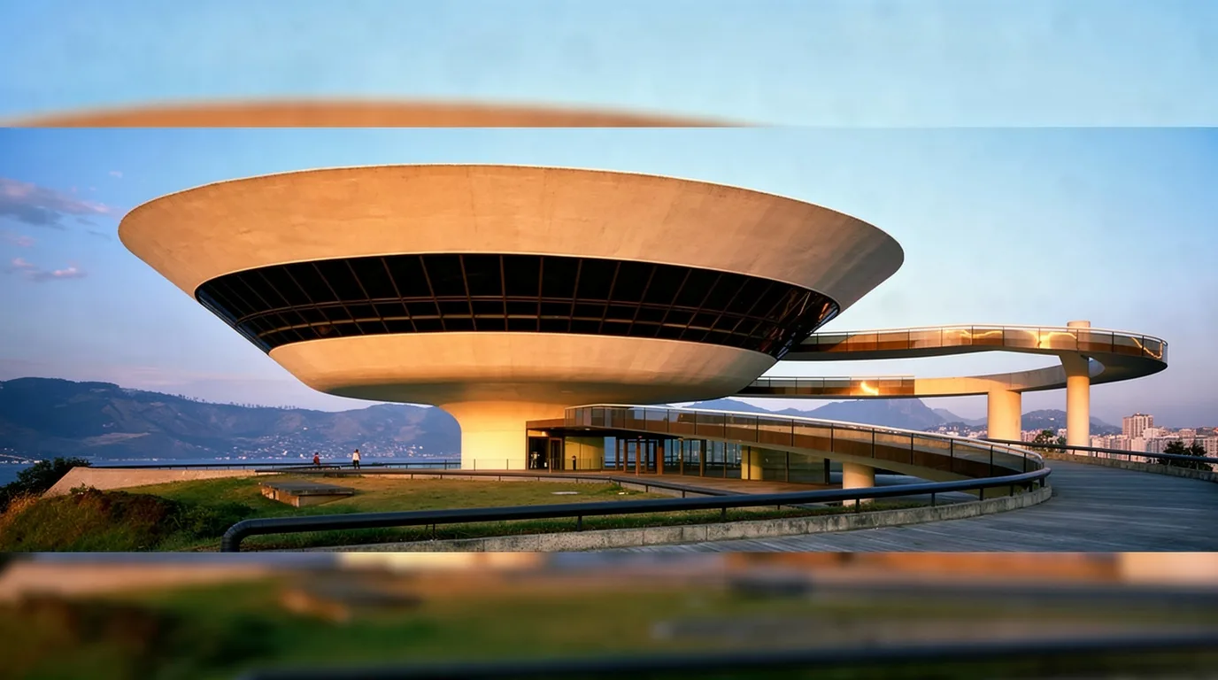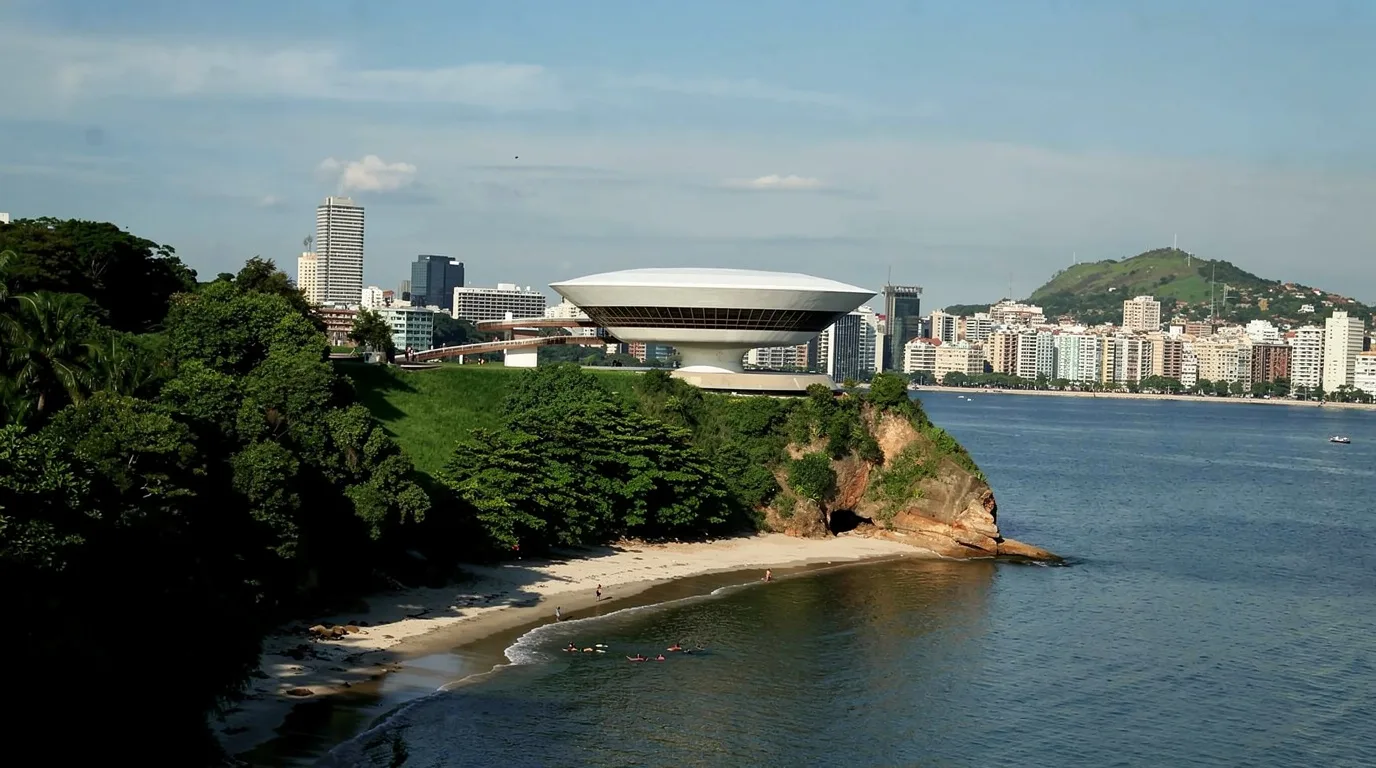 Проект создан Оскаром Нимейером. Здание напоминает летающую тарелку. Оно возвышается над водой, создавая эффект невесомости. Конструкция опирается на узкое основание. Это делает объект визуально легким. Внутри расположены выставочные залы. Архитектура сочетает бетон и стекло. Здание стало символом города. Это один из самых известных музеев мира. И пример модернистской фантазии. Сам Оскар Нимейер о своем творении сказал: «Когда-то давно пролетавшая над городом летающая тарелка восхитилась красотами этих мест и решила остаться здесь навсегда и, приземлившись на этом месте, положила начало музею современного искусства».