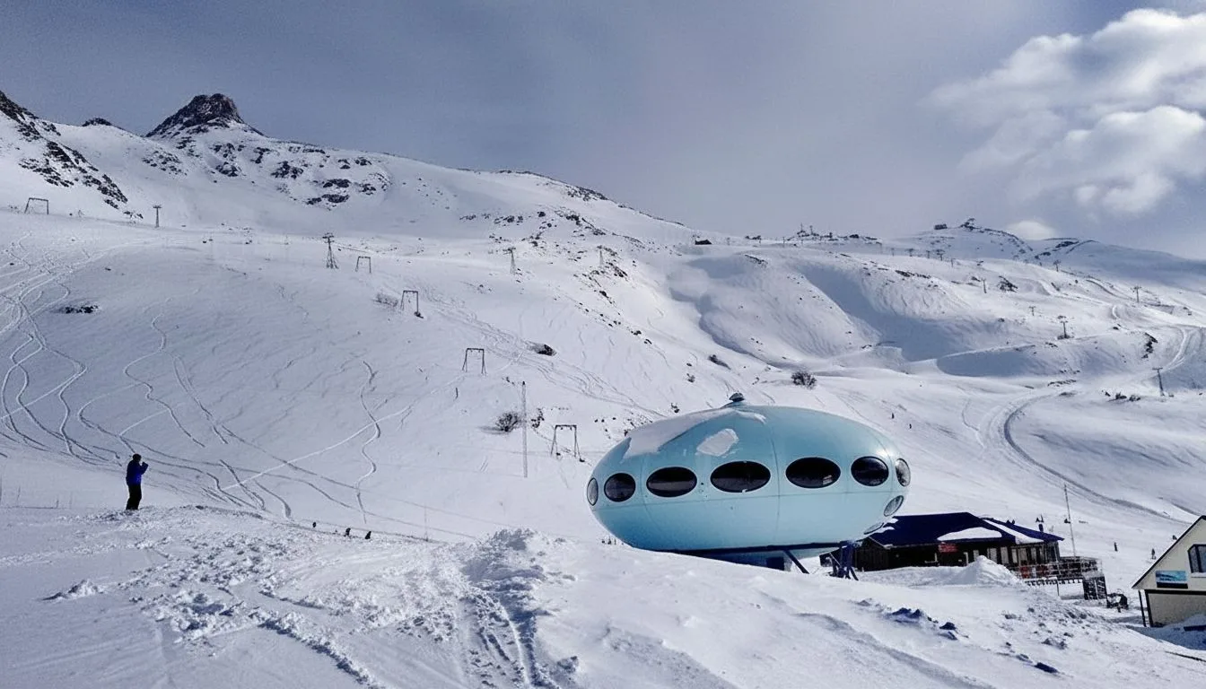 Этот объект выглядит как классическое НЛО. Он расположен высоко в горах. Здание было подарено Домбаю финским президентом Урхо Кекконеном. Постройка выполнена из легких материалов. Внутри — компактные номера. Архитектура отражает идеи мобильности. Объект до сих пор функционирует и привлекает туристов. Это редкий пример «космического» дизайна в СССР. И настоящий символ эпохи.