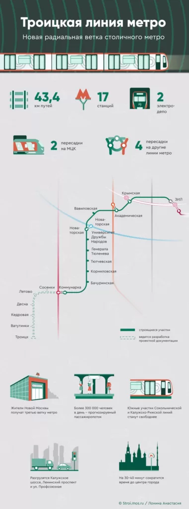 Завершение основных работ по строительству первой очереди Троицкой линии от «ЗИЛ» до «Коммунарки» намечено на 2024 год, а в 2028-2029 годах обещают завершить сооружение электродепо «Троицкое».