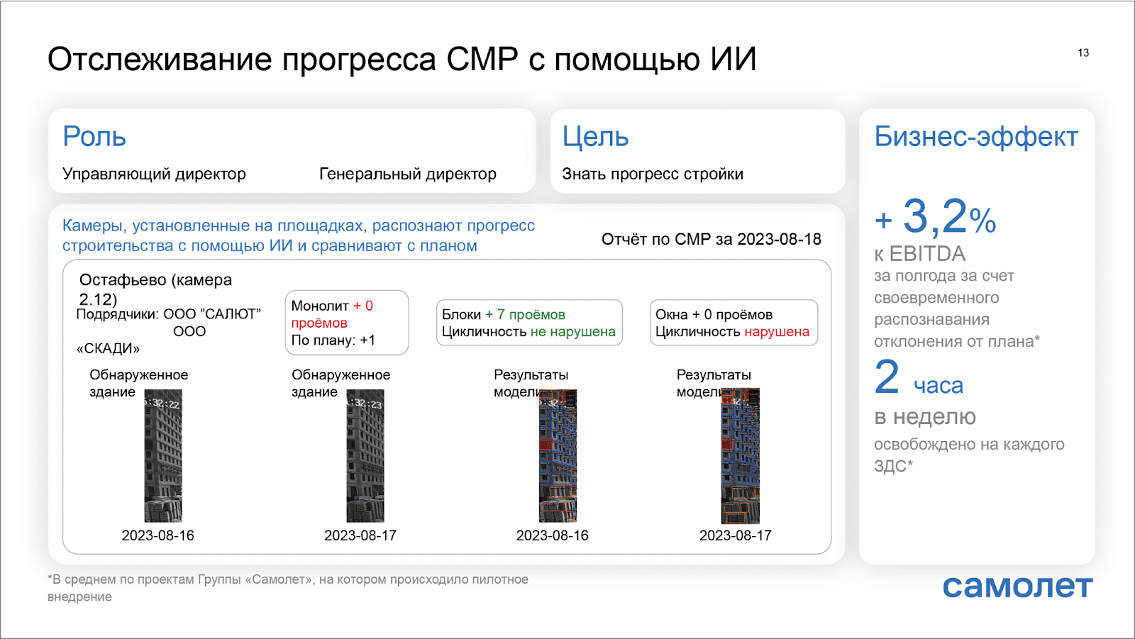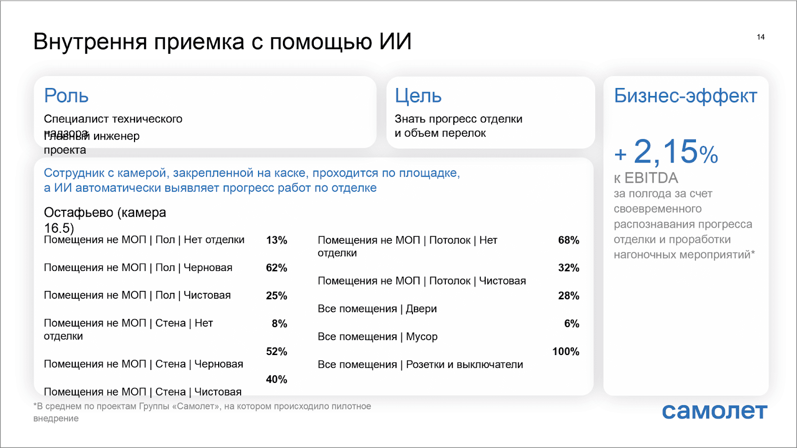 Сотрудник с камерой, закрепленной на каске, проходится по площадке, а ИИ автоматически выявляет прогресс работ по отделке. Результат — +2,15% к EBITDA.