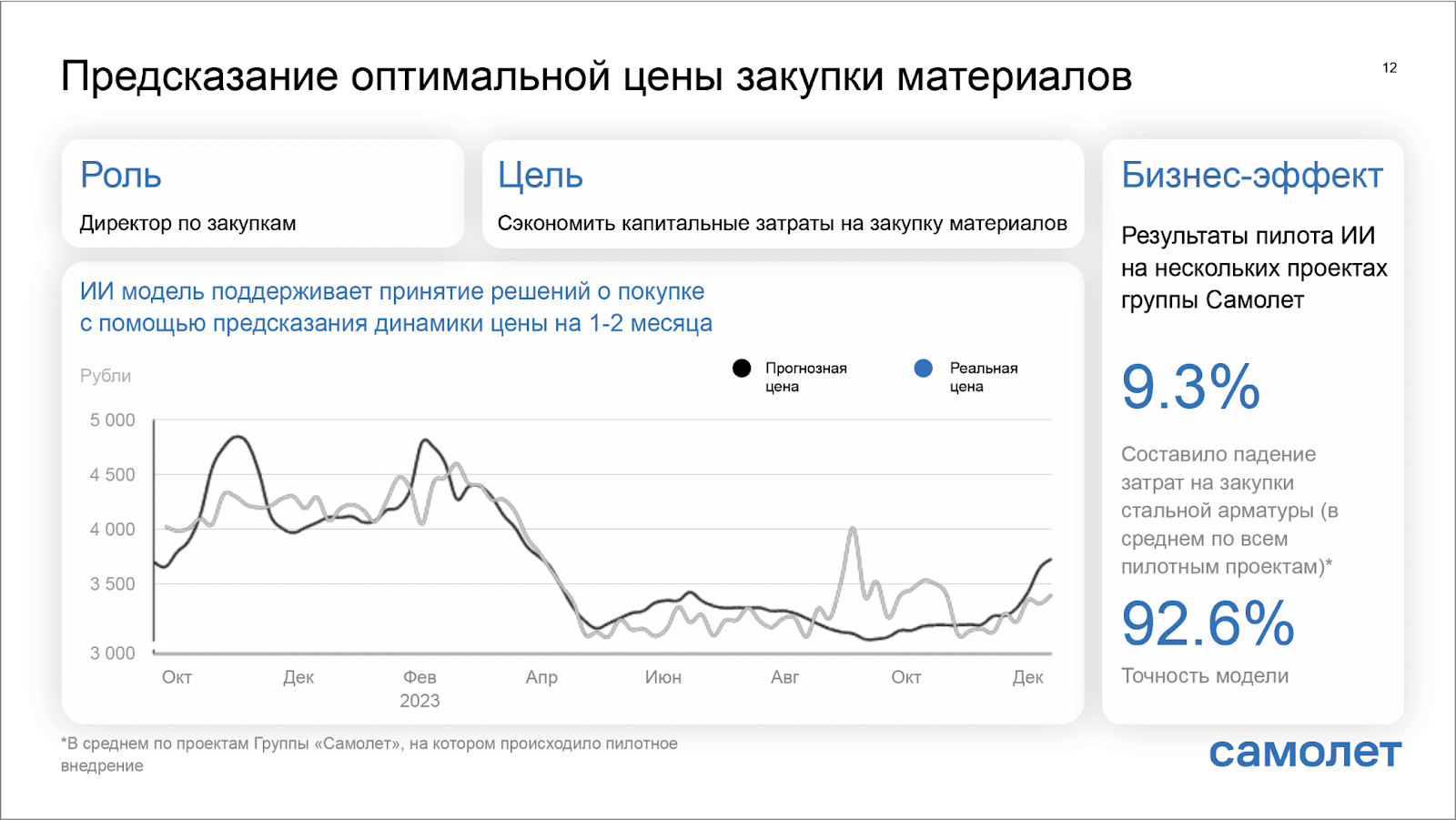 Это предсказание оптимальной цены закупки материалов. ИИ-модель с точностью до 92,6% предсказывает динамику стоимости материалов на 1-2 месяца вперёд. Результат — затраты на закупку стальной арматуры упали на 9,3%.