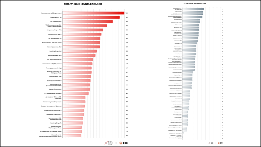 *При оценке и ранжировании рекламных поверхностей следует учитывать уникальные задачи каждого бренда, а также особенности конкретной рекламной кампании. Рейтинг медиафасадов составлен с учетом целей девелопера ФСК и не учитывает гео привязку к торговым точкам и местам скопления узкой аудитории (например, бизнес-кластеры), а также другие факторы, которые могут быть важны для рекламодателей.