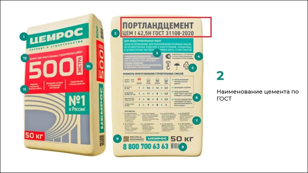 Отдельно остановимся на маркировке упаковки согласно государственному стандарту. Условное обозначение цемента регламентируется стандартом ГОСТ 31108–2020 «Цементы общестроительные. Технические условия». Согласно этому стандарту, условное обозначение цемента состоит из нескольких частей.