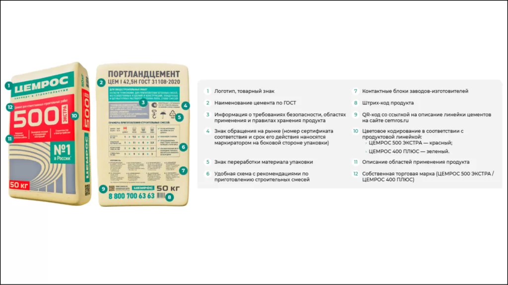 Из обязательной информации на упаковке цемента – знак обращения на рынке. Номер сертификата соответствия и срок его действия могут наноситься маркиратором на боковой стороне мешка. На своих упаковках в ЦЕМРОСе указывают также информацию о требованиях безопасности, областях применения и правилах хранения продукта, наносят знак переработки материала упаковки, штрих-код продукта, QR-код со ссылкой на сайт ЦЕМРОСа. Также на всех мешках размещена удобная схема с рекомендациями по приготовлению строительных смесей.