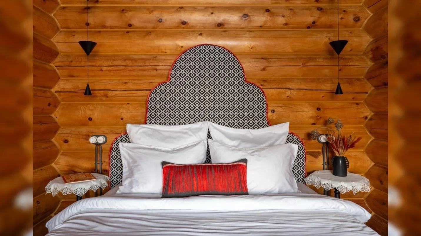 Особую выразительность интерьеру придают детали. Один из ключевых элементов — изголовья кроватей, выполненные в форме кокошников. Это тонкая и деликатная отсылка к русской культуре, переосмысленная в современном ключе. Один вариант решен в сдержанной графитовой гамме с классическим силуэтом и декоративными элементами, другой — более сложный по форме, с геометричным рисунком ткани. Эти акценты не доминируют, а мягко вплетаются в общую композицию.
