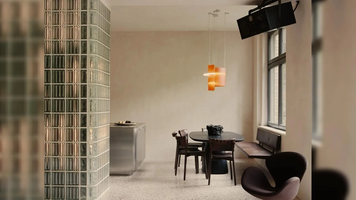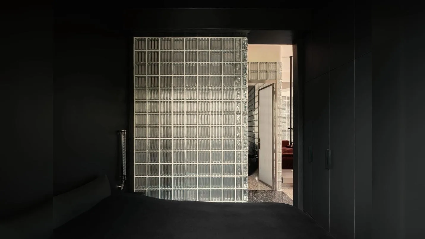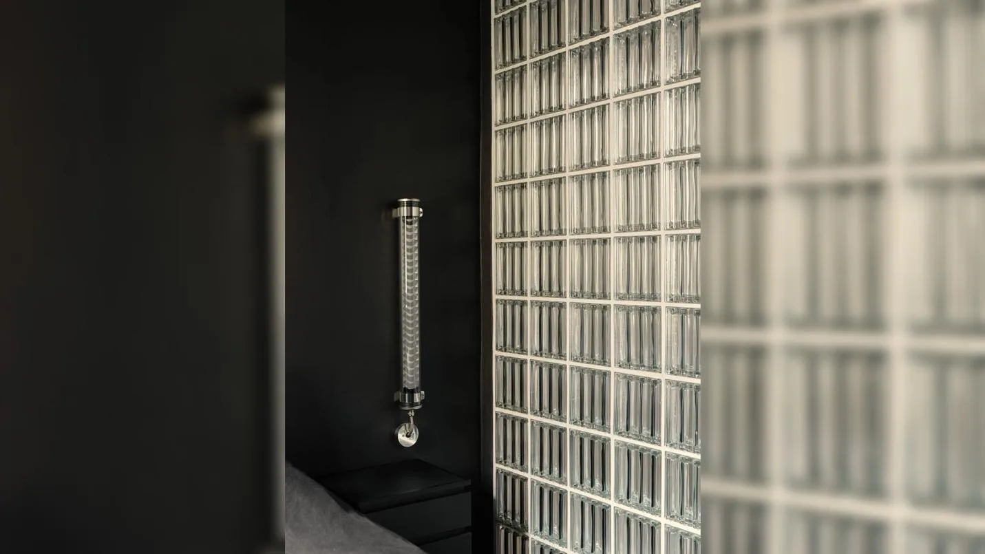 Ключевым элементом интерьера стала изогнутая перегородка из стеклоблоков. Она выполняет сразу несколько функций: зонирует пространство, отделяя входную группу от гостиной, и одновременно сохраняет визуальную легкость благодаря пропусканию света. Встроенная подсветка создает мягкое рассеянное свечение, формируя особую атмосферу, которая не характерна для классических берлинских интерьеров. Этот прием стал центральным художественным решением проекта — именно свет здесь выступает как главный инструмент формирования среды.