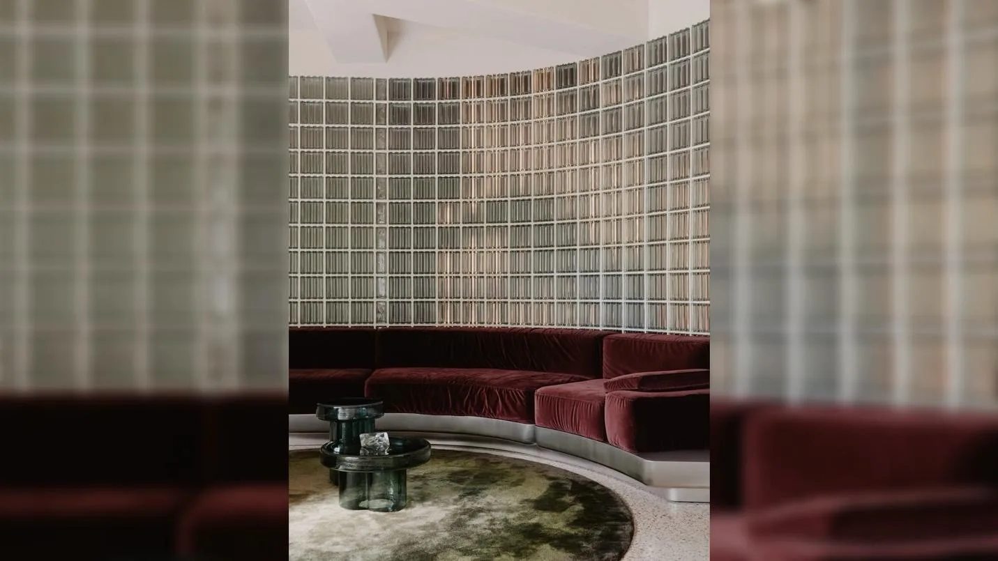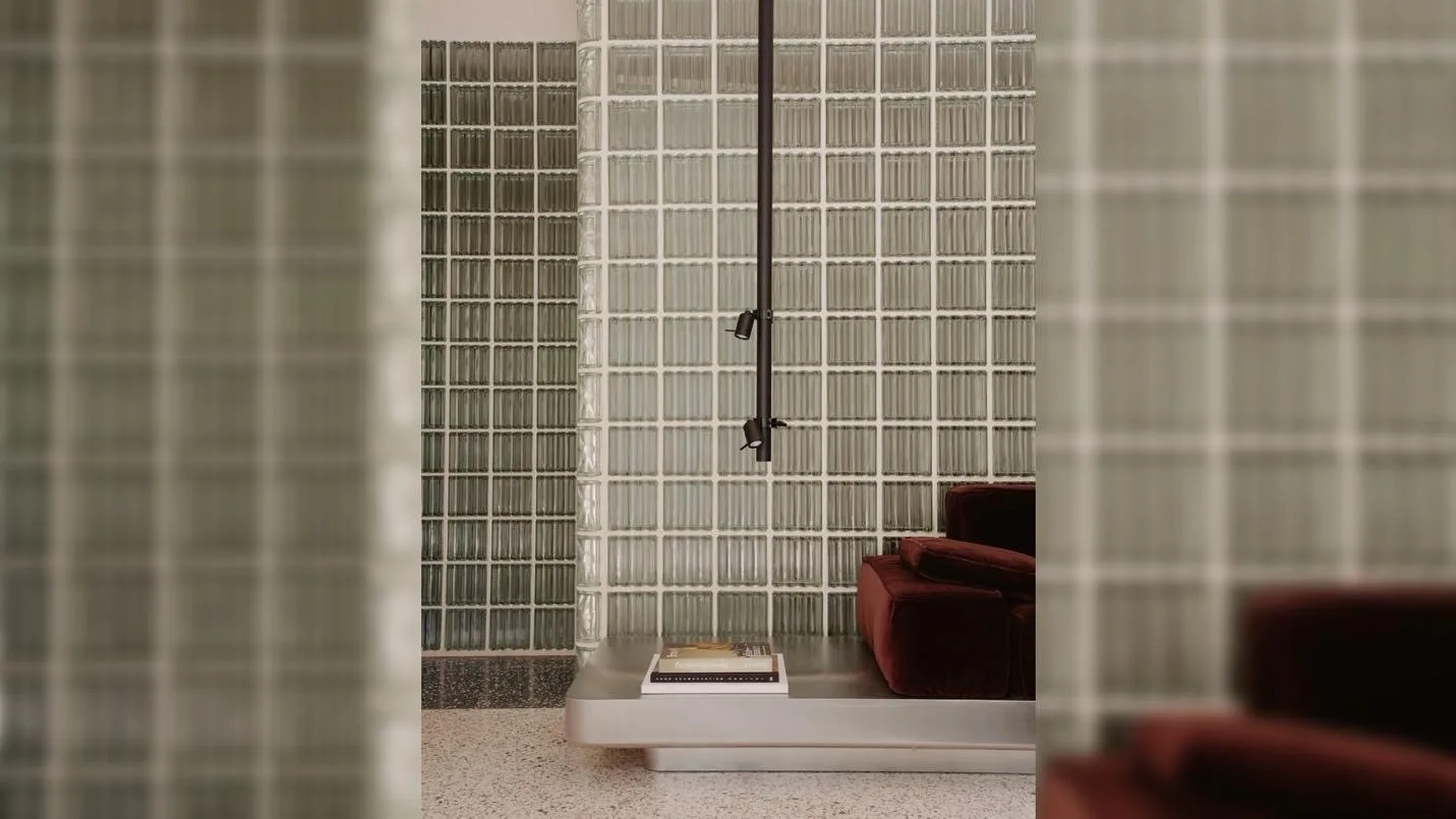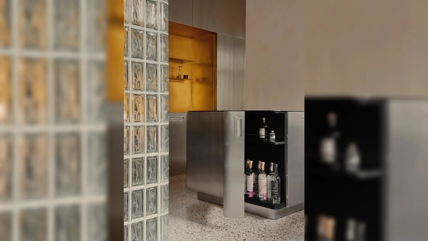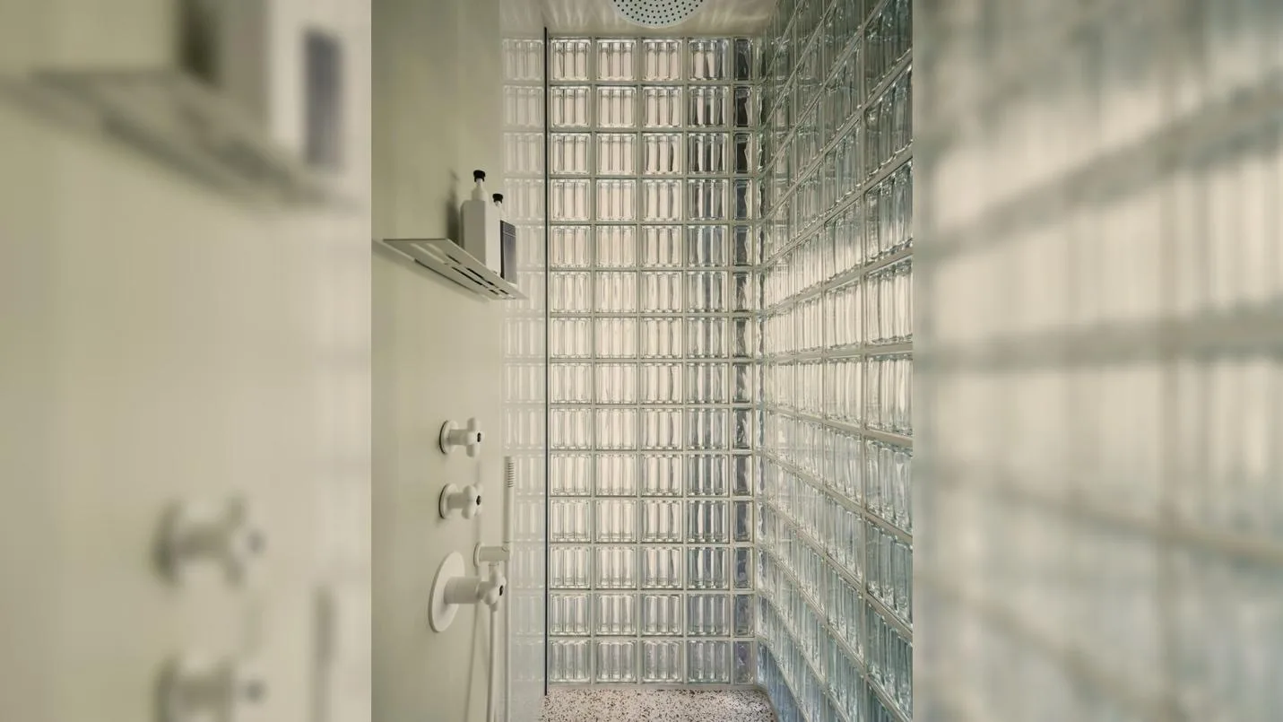 Ключевым элементом интерьера стала изогнутая перегородка из стеклоблоков. Она выполняет сразу несколько функций: зонирует пространство, отделяя входную группу от гостиной, и одновременно сохраняет визуальную легкость благодаря пропусканию света. Встроенная подсветка создает мягкое рассеянное свечение, формируя особую атмосферу, которая не характерна для классических берлинских интерьеров. Этот прием стал центральным художественным решением проекта — именно свет здесь выступает как главный инструмент формирования среды.