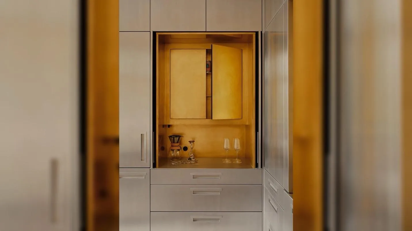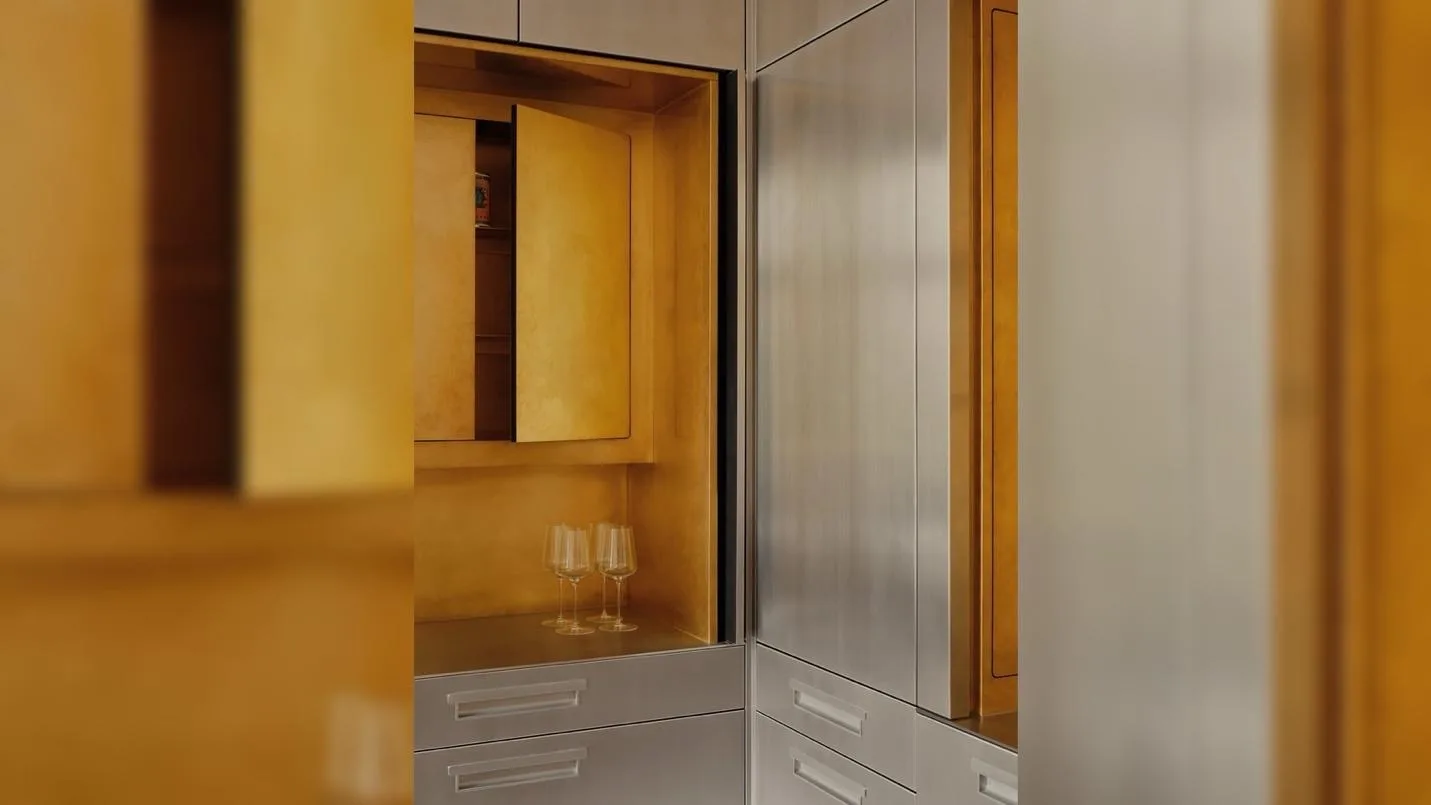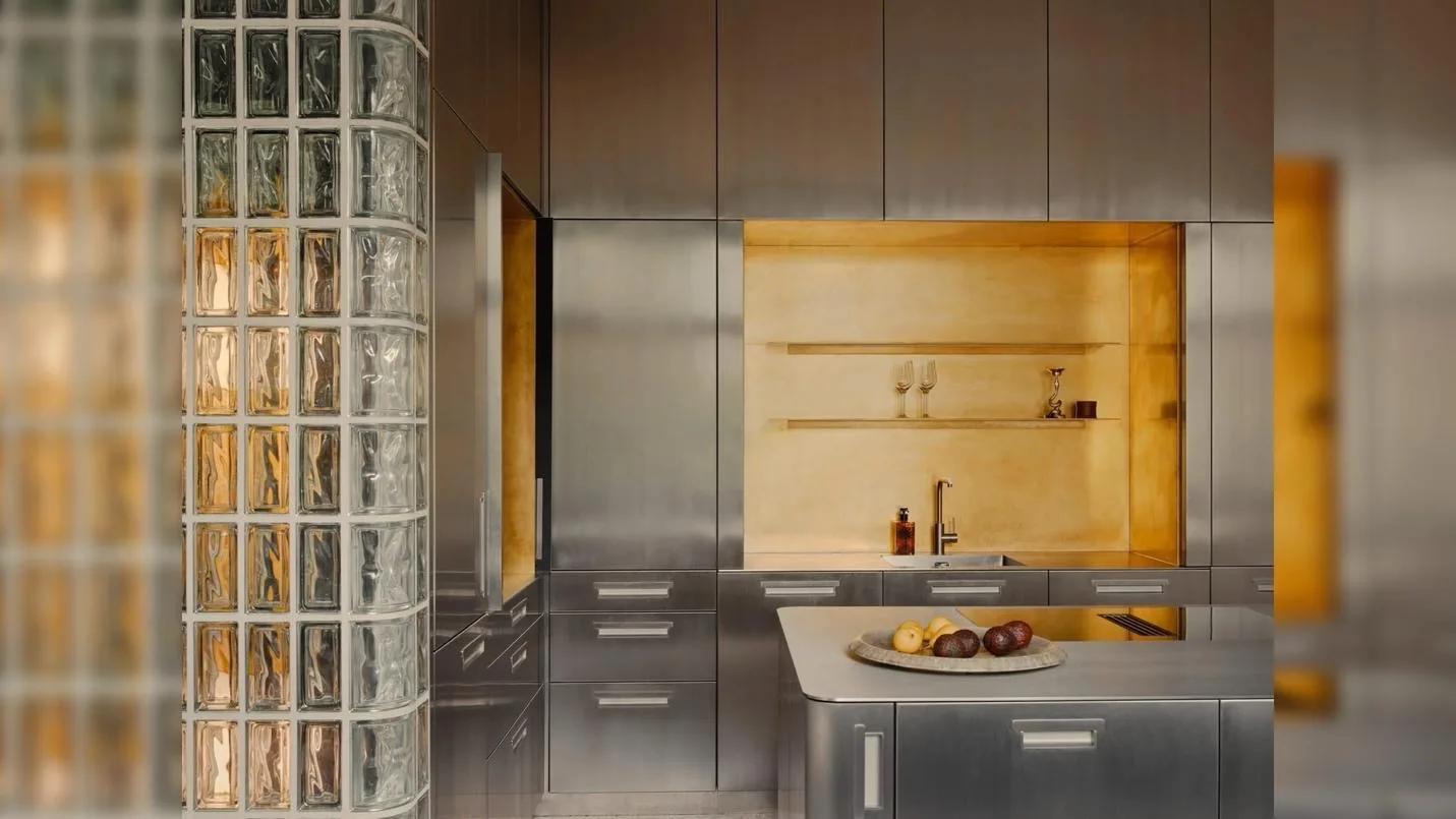 Материальная палитра проекта заслуживает отдельного внимания. В основе — индустриальные решения: нержавеющая сталь, необработанная латунь, открытые конструкции. Кухня выполнена в максимально утилитарной эстетике, где металл становится не просто отделкой, а смысловым акцентом. При этом архитекторы сознательно добавляют теплые, тактильные поверхности: стены покрыты фактурной известковой штукатуркой, а в текстиле используется бархат Kvadrat, отсылающий к европейскому дизайну середины XX века. Такое сочетание позволяет избежать ощущения холодности и делает пространство пригодным для жизни.