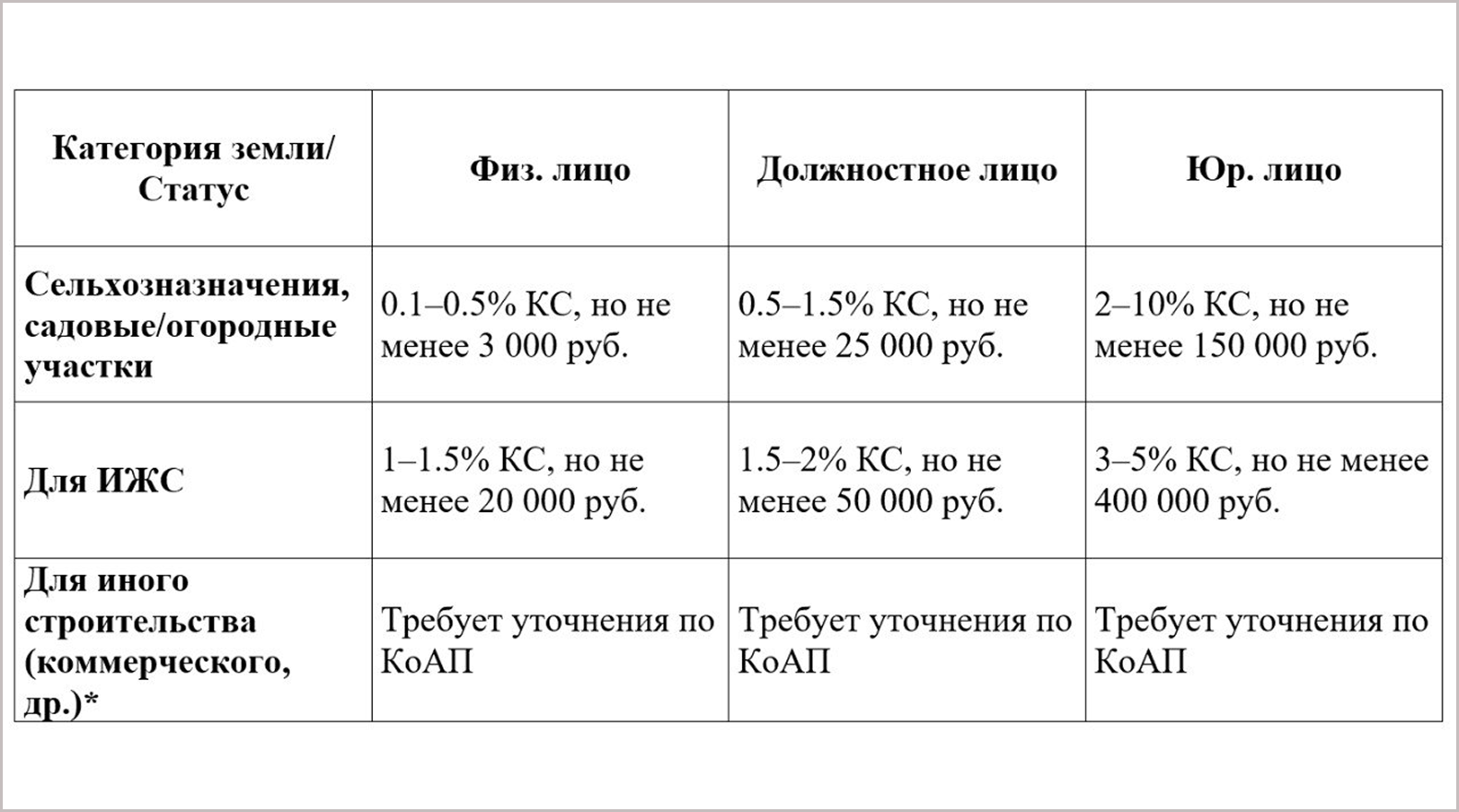Размер штрафа зависит от категории земли и кадастровой стоимости (КС). Подробнее в таблице ниже.