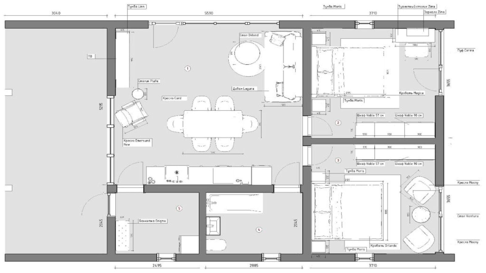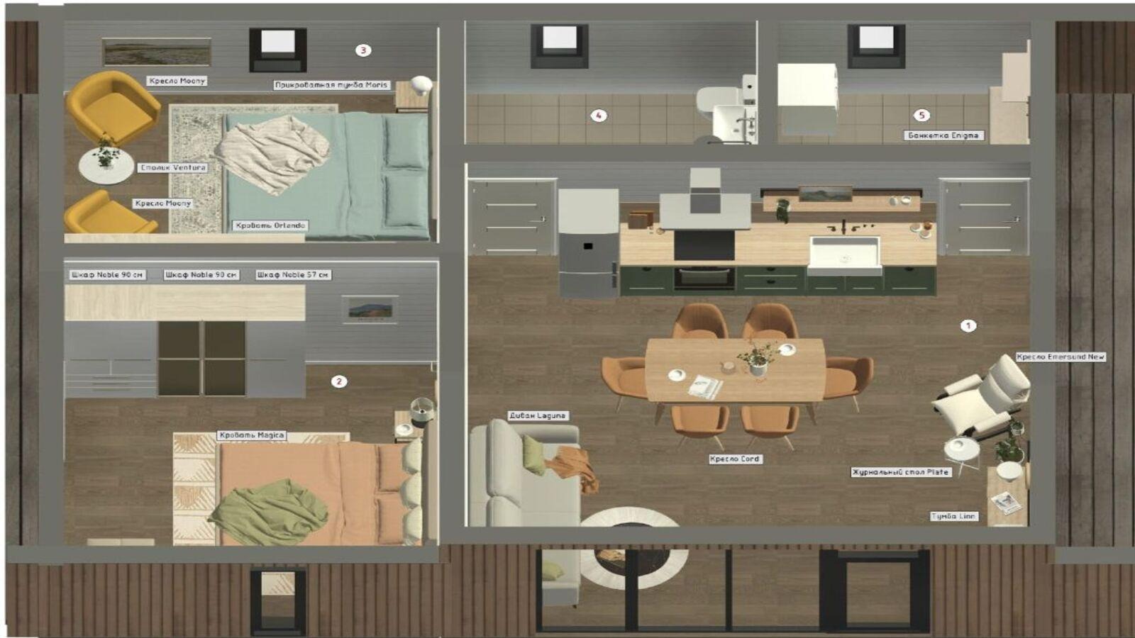 - общая жилая зона (кухня-гостиная),