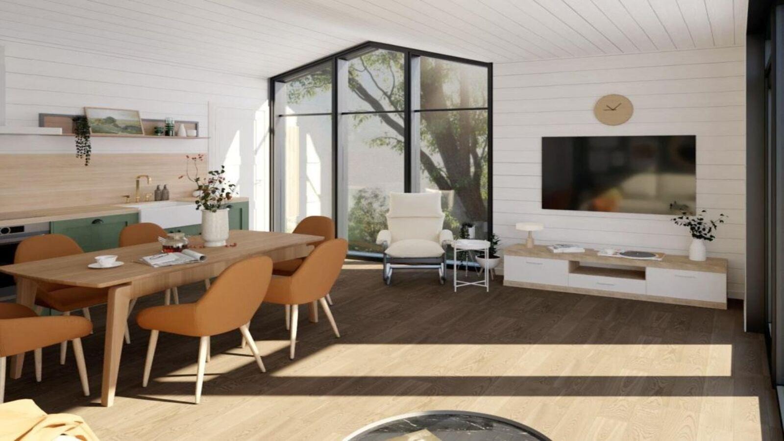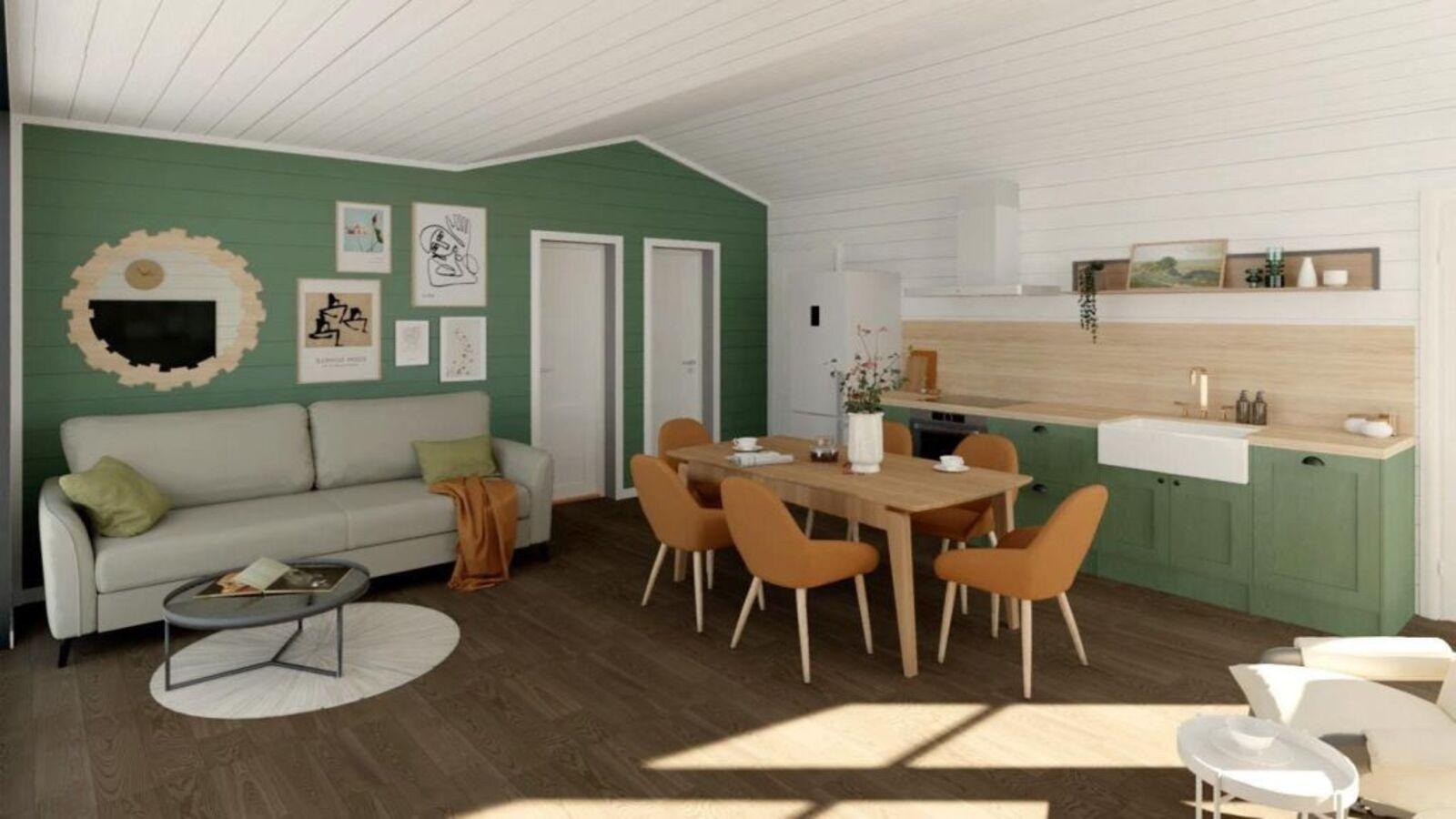Несмотря на скромный метраж, пространство дома организовано так, что в нём есть всё необходимое для комфортной жизни. Ключевым приемом стало объединение кухни, столовой и гостиной в общее пространство. Это визуально расширяет дом и делает его «дышащим».