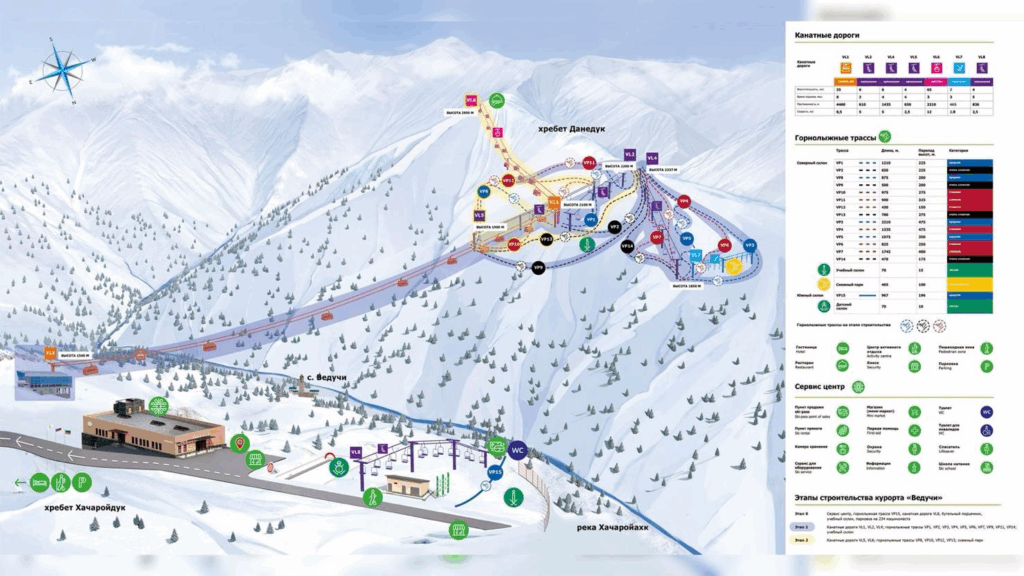 Сезон катания на курорте «Ведучи» длится с января по март, но после строительства инфраструктуры на северо-ориентированном склоне, где снег лежит с октября, сезон продлится с ноября по апрель. Из-за возможного отсутствия снега в январе на курорте установлена система искусственного оснежения. Перед поездкой рекомендуется проверить, открыты ли трассы. На курорте проложена одна горнолыжная трасса длиной 967 метров со средней сложностью («синяя»), с перепадом высот в 196 метров. Также есть учебный склон и 70-метровая тюбинговая горка. Для обучения детей есть детский парк с трамплинами и фигурами. Подъемники включают 4-местный кресельный подъемник, обслуживающий южный склон и ведущий к трассе, и 77-метровую безопорную канату для учебного склона. Строится гондольная канатная дорога длиной 4400 метров, соединяющая северный и южный склоны. Ски-пассы пока только дневные и прогулочные. На территории курорта есть два гостиничных комплекса. Первый — 3-звездочный отель (86 номеров) с видами на горы, комплексный завтрак, барами, зоной отдыха с бассейном и хамамом. Второй комплекс ориентирован на молодежь, с девятью двухместными номерами экономкласса и хостелом. В номерах есть холодильник, телевизор, кондиционер, сейф и чайные принадлежности. Также в нем имеется кинозал.