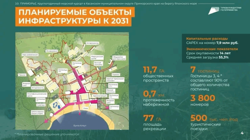 По проекту, на территории туристического комплекса общей площадью более 150 га разместятся 7 гостиниц разной звездности, апартаменты на 3,8 тыс. номеров, аквапарк с подогреваемыми открытыми бассейнами, бани, школа водных видов спорта, парк развлечений, медицинский центр, многофункциональная арена, рыбный рынок и другие объекты. Также у курорта будет собственный благоустроенный пляж протяженностью порядка 1,5 км. И все это — всего лишь в 200 км от Владивостока, где находятся железнодорожный и морской вокзалы, международный аэропорт. Построить курорт планируется в три этапа. Так, с 2024 по 2027 год появятся первые 750 гостиничных номеров, затем, с 2026 по 2029 год, — еще 1460 номеров. Оставшиеся 1590 комнат предполагается построить в период с 2028 по 2031 год. Параллельно будут идти работы по отделке и оснащению объектов, благоустройству территории. В общей сложности в проект планируется вложить около 30 млрд рублей. Для создания архитектурного облика курорта власти Приморья намерены привлечь молодых архитекторов в рамках открытого международного архитектурного конкурса объектов курорта.