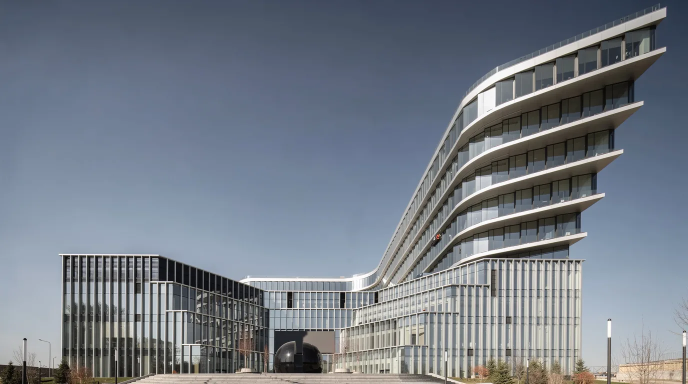 Фасады здания выполнены преимущественно из стекла с различной пластикой в верхней и нижней частях. Нижний объём визуально более сложный и структурный, верхний — более лаконичный, с акцентом на ритм и вертикальные элементы. В проекте использованы стеклопакеты с повышенными характеристиками безопасности и энергоэффективности, обеспечивающие комфортный микроклимат внутри здания.