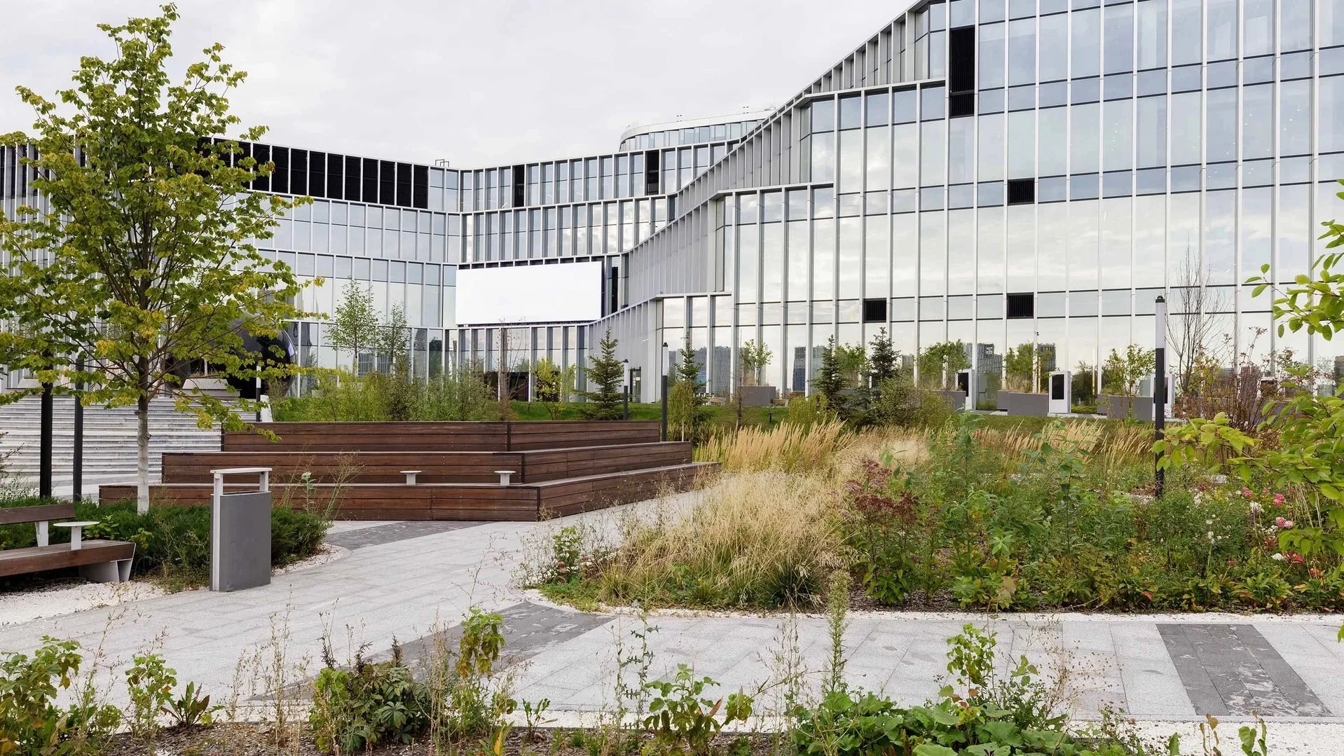 Территория кампуса стала частью городской среды: ранее закрытое пространство открыли для горожан, здесь появились новые пешеходные маршруты, сквер и общественная площадь. Планировочная структура выстроена вокруг амфитеатра, к которому сходятся пешеходные улицы. В центре композиции расположен дуб, выбранный как символ знания и устойчивости.