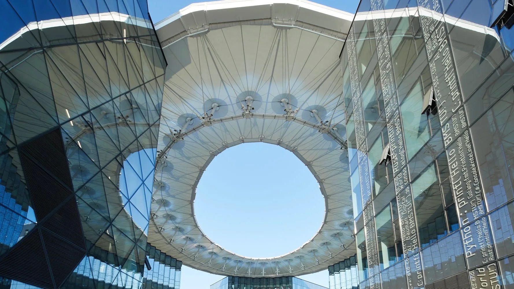 Фасады зданий, формирующих периметр амфитеатра, выполнены с использованием стеклянных ламелей, на которые нанесены формулы и тексты. Этот приём позволяет сохранить целостность ансамбля и одновременно задать визуальные различия между корпусами.