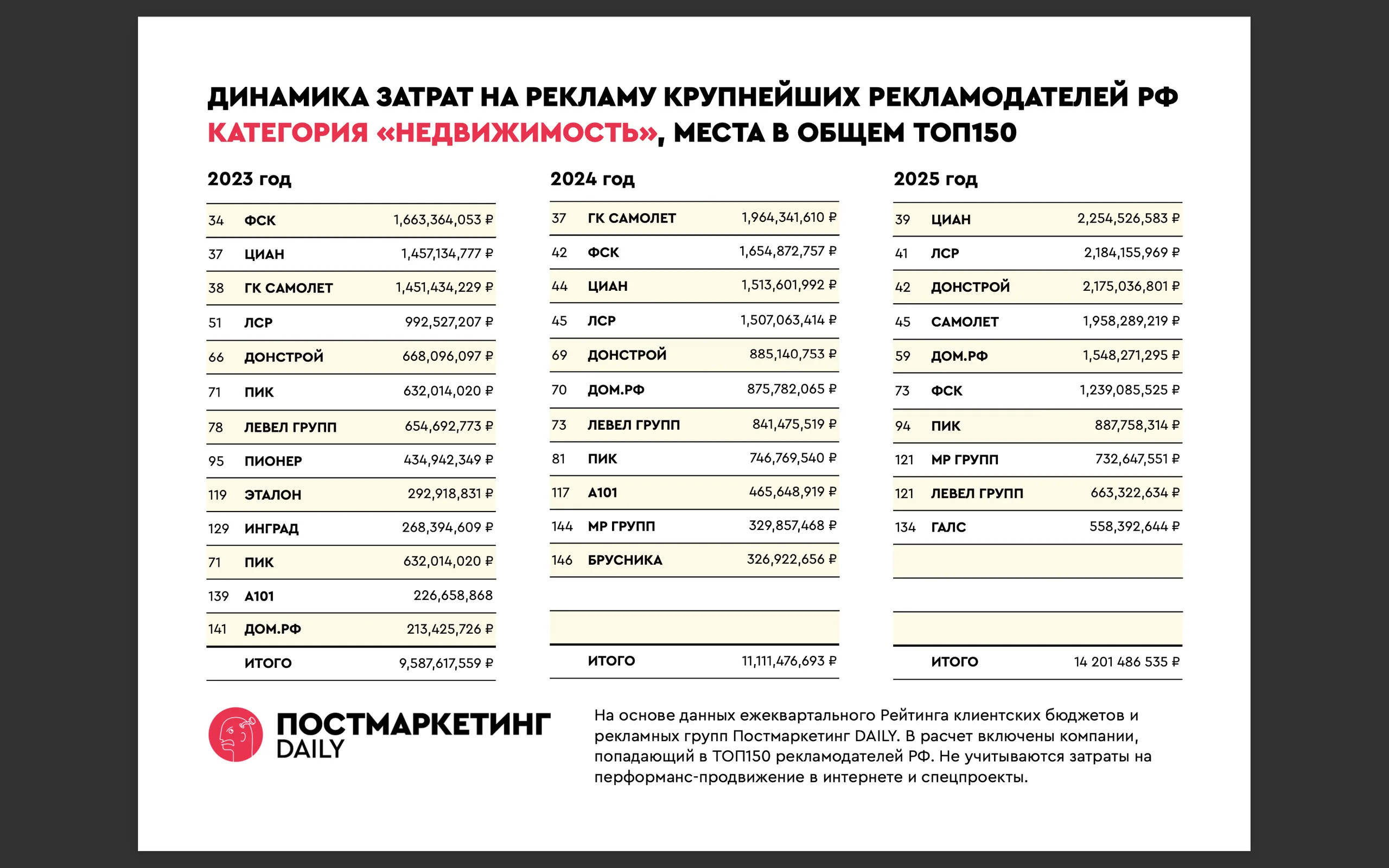 - В 2025 году в рейтинг вошёл «Галс Девелопмент», а «Самолет» сместился с 1-го места на 4-е среди рекламодателей в категории недвижимости. Вторую строчку, которую ранее занимала ГК ФСК (теперь на 6-м), занял «ЛСР», поднявшись с 4-го места.