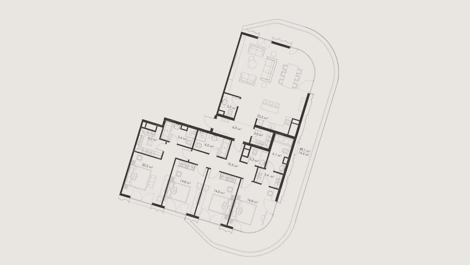 Продуманная планировка четко разделяет пентхаус на приватную и общую зоны. Центром притяжения станет просторная гостиная с прямым выходом на террасу площадью 48,1 квадратных метра, которая опоясывает резиденцию с трех сторон. Пространство гостинной можно объединить с обеденной зоной и кухней, а можно зонировать за счет перегородок.
