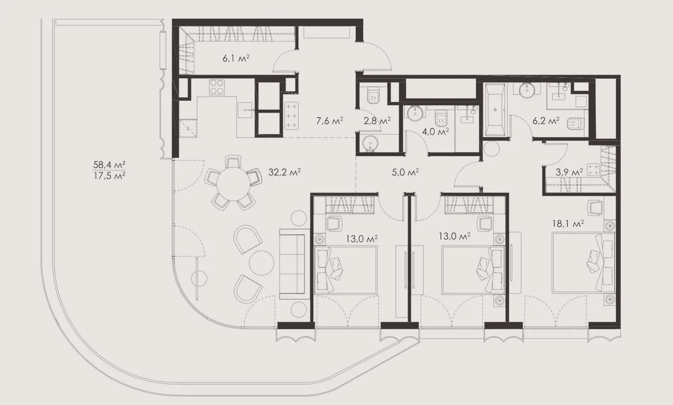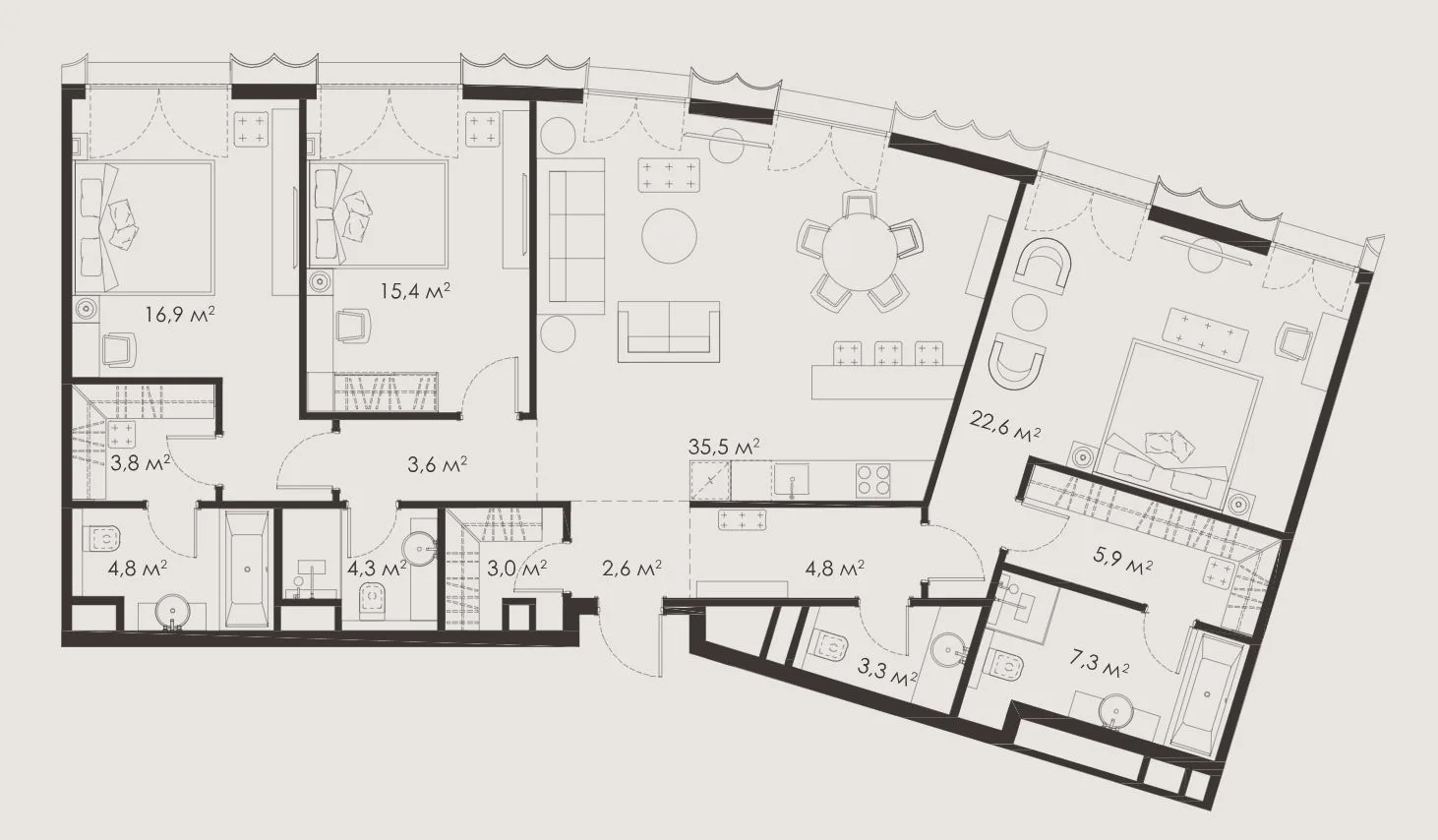 Самый просторный и эксклюзивный вариант в коллекции резиденций — четырехкомнатный пентхаус площадью 189,3 квадратных метра. Аналогов на рынке недвижимости столицы этому лоту практически нет. Ведь он обладает уникальным архитектурным решением — полукруглой террасой на три стороны света, что не просто увеличит доступность естественного солнечного света в комнаты, но и позволит распределить жилые комнаты под режим их владельцев. Выбрать окна с видом на рассвет или закат. К тому же благодаря высоте потолков в 3,5 метра и панорамному остеклению перед жителями пентхауса откроются вдохновляющие виды на величественное здание главного ВУЗа страны — МГУ, архитектурно-выразительную Мосфильмовскую улицу и утопающие в зелени дворы. Жилое пространство будет наполнено светом и воздухом с утра до вечера.