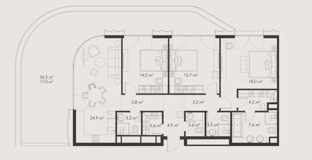 Планировочное решение пентхауса предусматривает одну мастер-спальню с просторной гардеробной зоной и две комнаты, которые вариативно могут стать детскими, гостевой или кабинетом. Чтобы разграничить приватную хозяйскую часть от гостевой, предусмотрены два дополнительных санузла, один из которых можно сделать гостевым. Особая функция для ценителей порядка — большая гардеробная в холле. Она принимает на себя функцию хранения верхней одежды и сезонных вещей, разгружая жилые комнаты и сохраняя ощущение максимально свободного пространства.