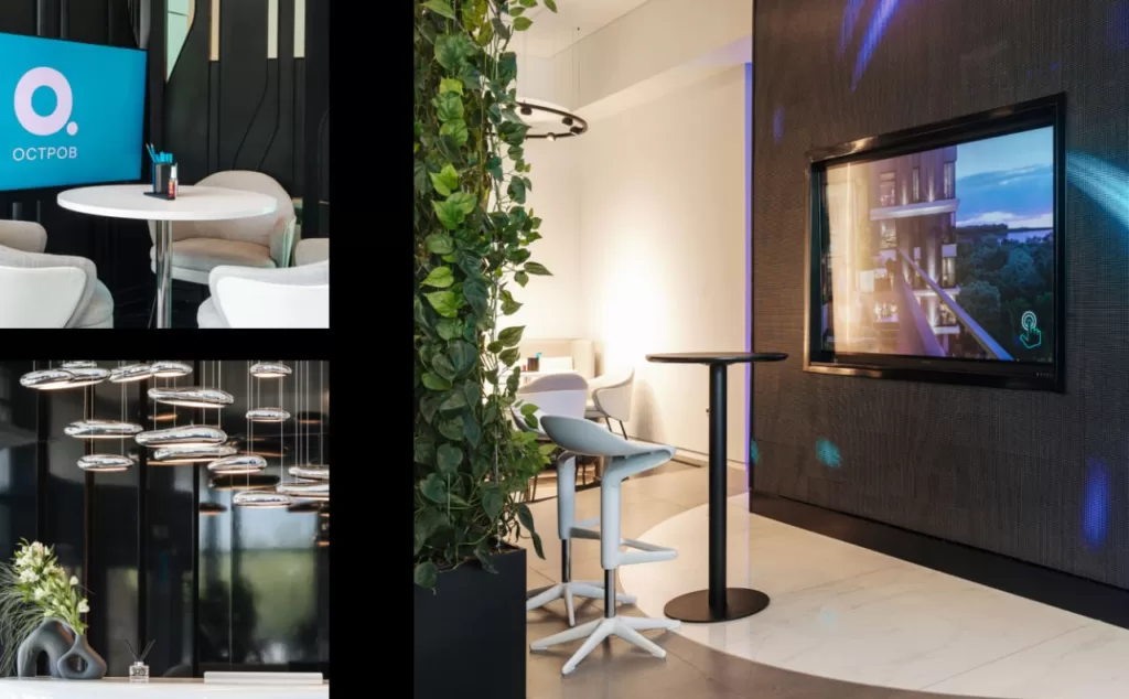 Преимущества проекта гостям демонстрируют на 6-метровом LED-экране, а также с помощью инновационной интерактивной карты и макетов кварталов «Острова». Также в пространстве продаж: 16 приватных переговорных зон и детская игровая с новаторскими гаджетами. В зоне демо-квартир представлены: модель полностью «готового» этажа, четыре меблированных квартиры, общий межквартирный коридор и лифтовой холл с аутентичной отделкой будущих корпусов. Фактически уже на входе в офис гости попадают в свое «настоящее будущее» на «Остров».