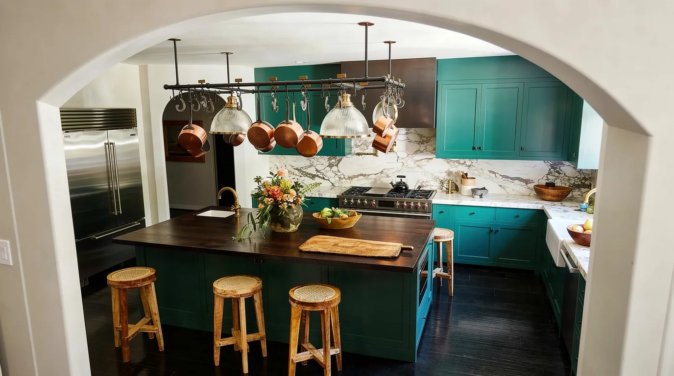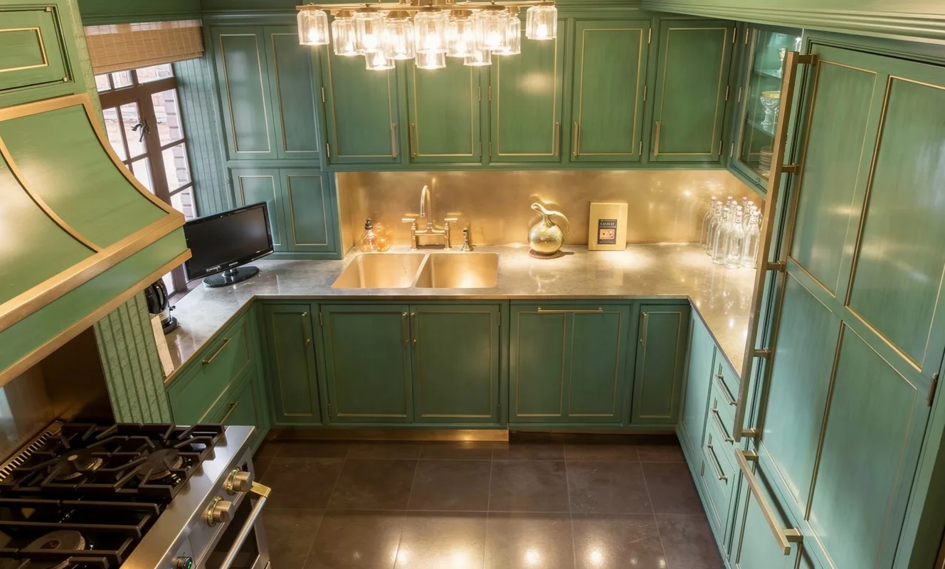 Совсем другой подход у Кэмерон Диас. Вместе с дизайнером Келли Уэстлер она создала яркое пространство с насыщенными оттенками. Глубокий зеленый цвет фасадов сочетается с металлическими элементами и контрастными поверхностями. Такая кухня не просто функциональна — она задает настроение всему дому. Идея: кухня может быть акцентом, а не фоном.