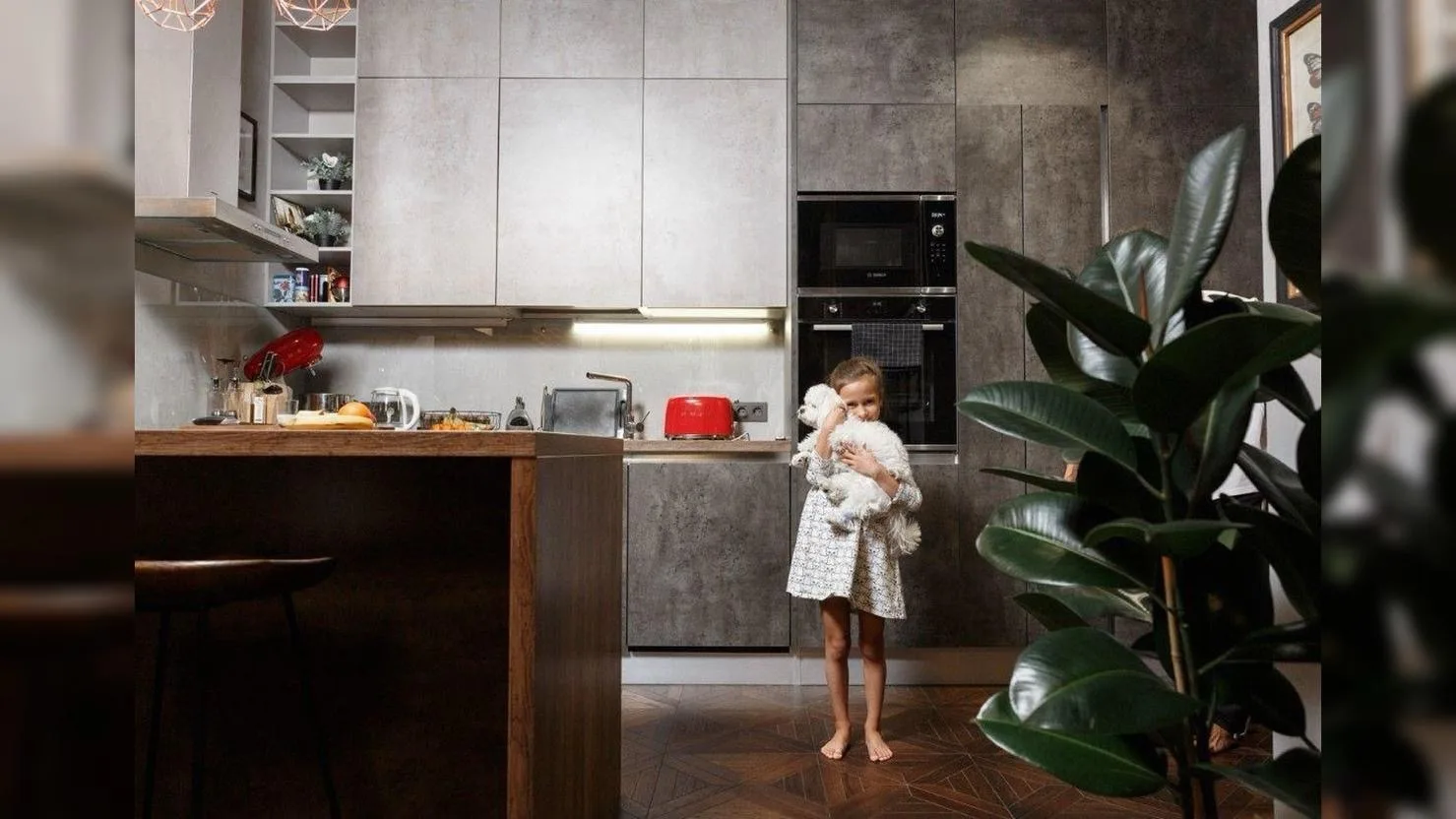 Комик Илья Соболев выбрал индустриальный стиль: фасады под бетон, отсутствие ручек, строгие линии. Интересный момент — кухня стала главным местом в доме, вытеснив даже обеденную зону. Это тренд последних лет: кухня объединяет функции.