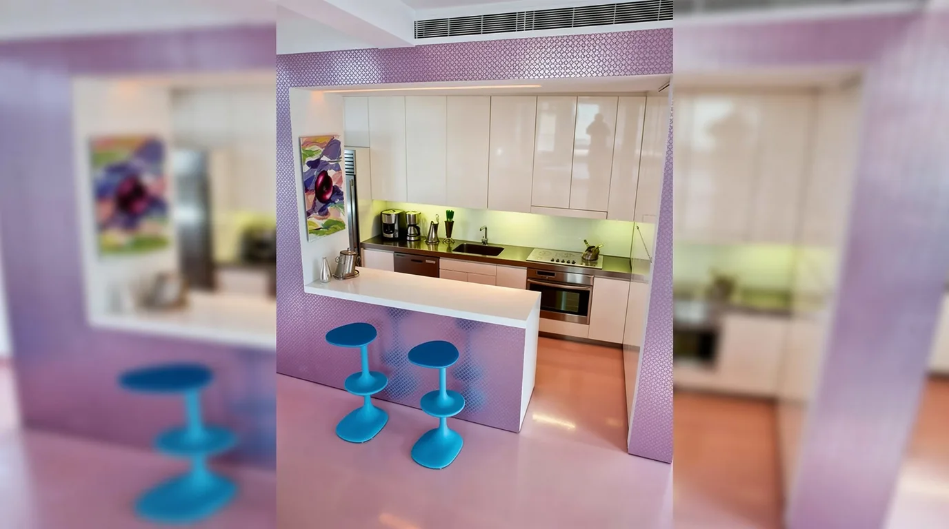 Для дизайнера Карима Рашида кухня — это экспериментальная площадка. Яркие цвета, необычные поверхности, авторская мебель — все пространство подчинено идее. Это пример того, как интерьер может стать продолжением личности.