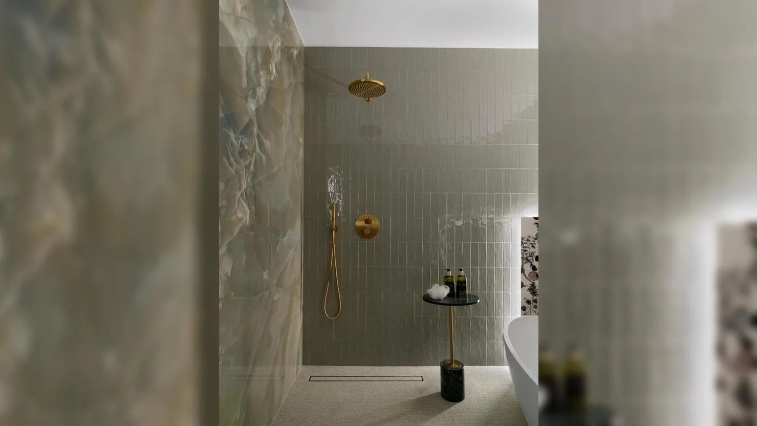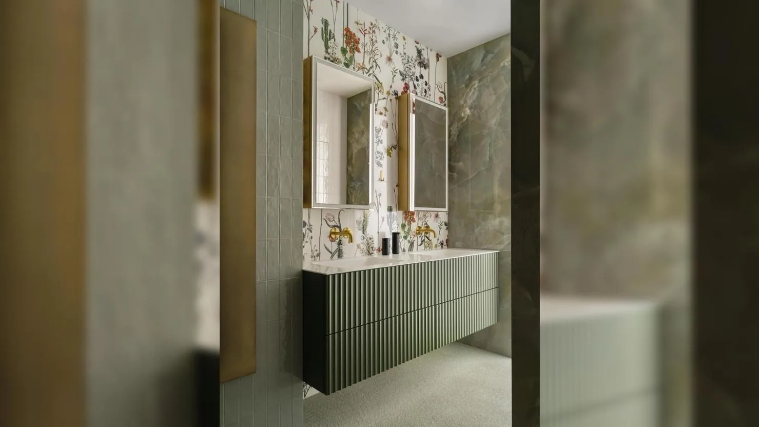 Ванная комната продолжает тему декоративности. Здесь использована плитка с цветочным орнаментом, но подана она нестандартно — в виде композиции, напоминающей ширму. Такой прием добавляет интерьеру игривости и отсылает к миру моды, где ширмы часто используются как элемент пространства.