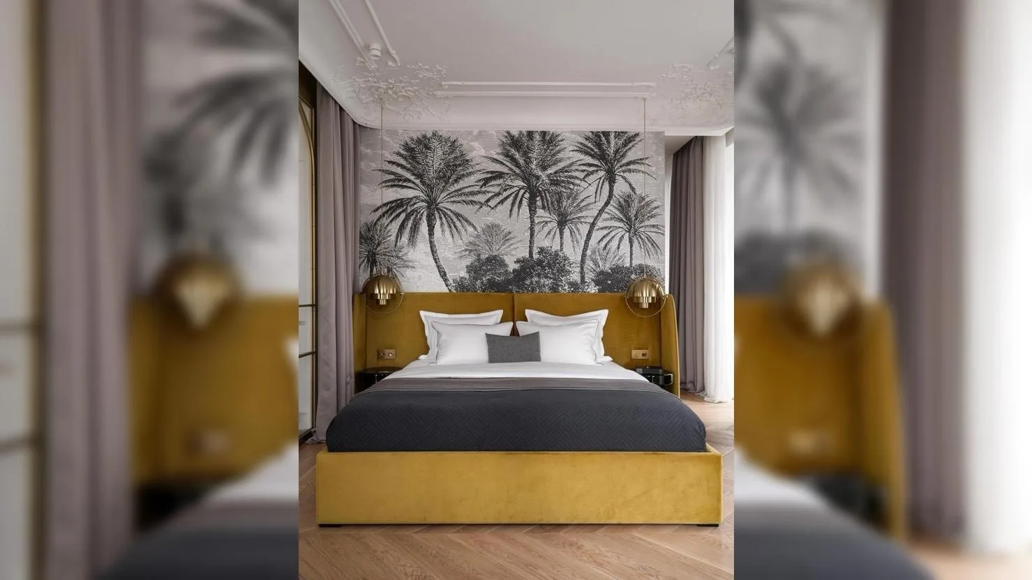 Кухня решена максимально деликатно. Она выполнена в цвете стен, благодаря чему визуально «растворяется» и не перетягивает внимание на себя. Это важный прием для небольших пространств. При этом детали проработаны тщательно: фасады верхних шкафов украшены каннелюрами, а рабочая поверхность и фартук выполнены из выразительного камня Patagonia, который добавляет интерьеру глубину и характер. Спальня стала отражением личной истории хозяйки. Любовь к путешествиям нашла визуальное воплощение в оформлении стены за изголовьем кровати — здесь размещено графичное панно с тропическими растениями. Этот мотив перекликается с татуировкой заказчицы и создает эмоциональную связь между интерьером и личностью. Кровать выполнена в горчичном оттенке — одном из любимых цветов хозяйки. Композицию дополняют подвесные светильники от Gubi и прозрачные столики от Miniforms, которые красиво взаимодействуют со светом.