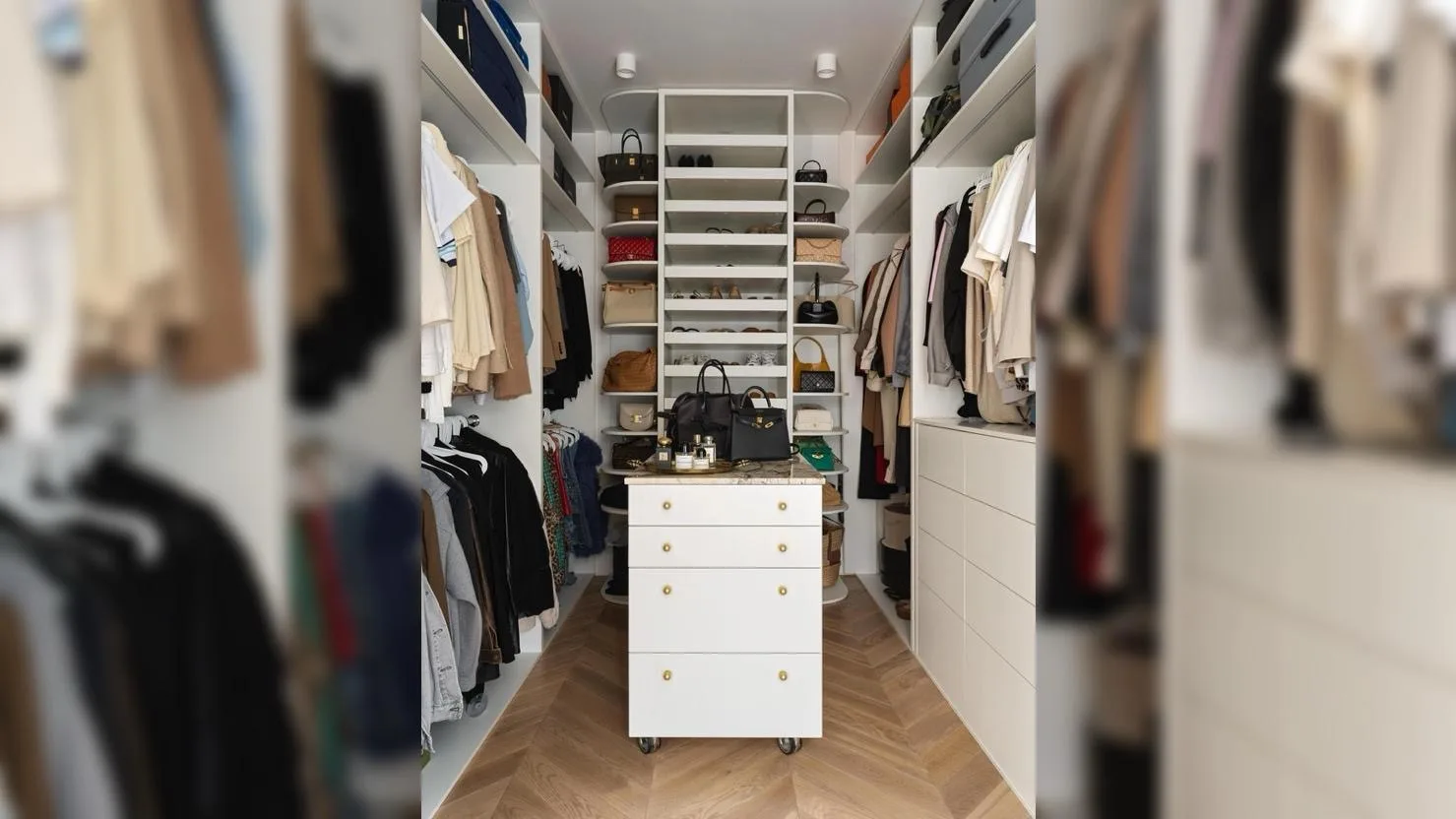 Особое внимание уделялось гардеробной — не просто зоне хранения, а полноценной съемочной площадке, где каждая деталь должна выглядеть эффектно. На момент начала работы квартира уже имела базовую планировку и предчистовую отделку. Пространство включало объединенную зону гостиной и спальни с панорамными окнами, просторный санузел и гардеробную. Основной задачей стало не столько перепланирование, сколько грамотная организация и визуальное зонирование. Для разделения спальни и гостиной использовали стеклянную перегородку — решение, которое позволило сохранить ощущение открытости и при этом добавить функциональности. Свет свободно проходит через пространство, усиливая ощущение воздуха.