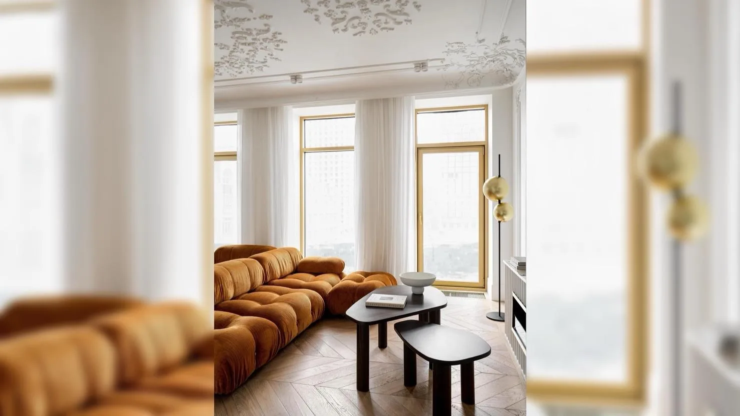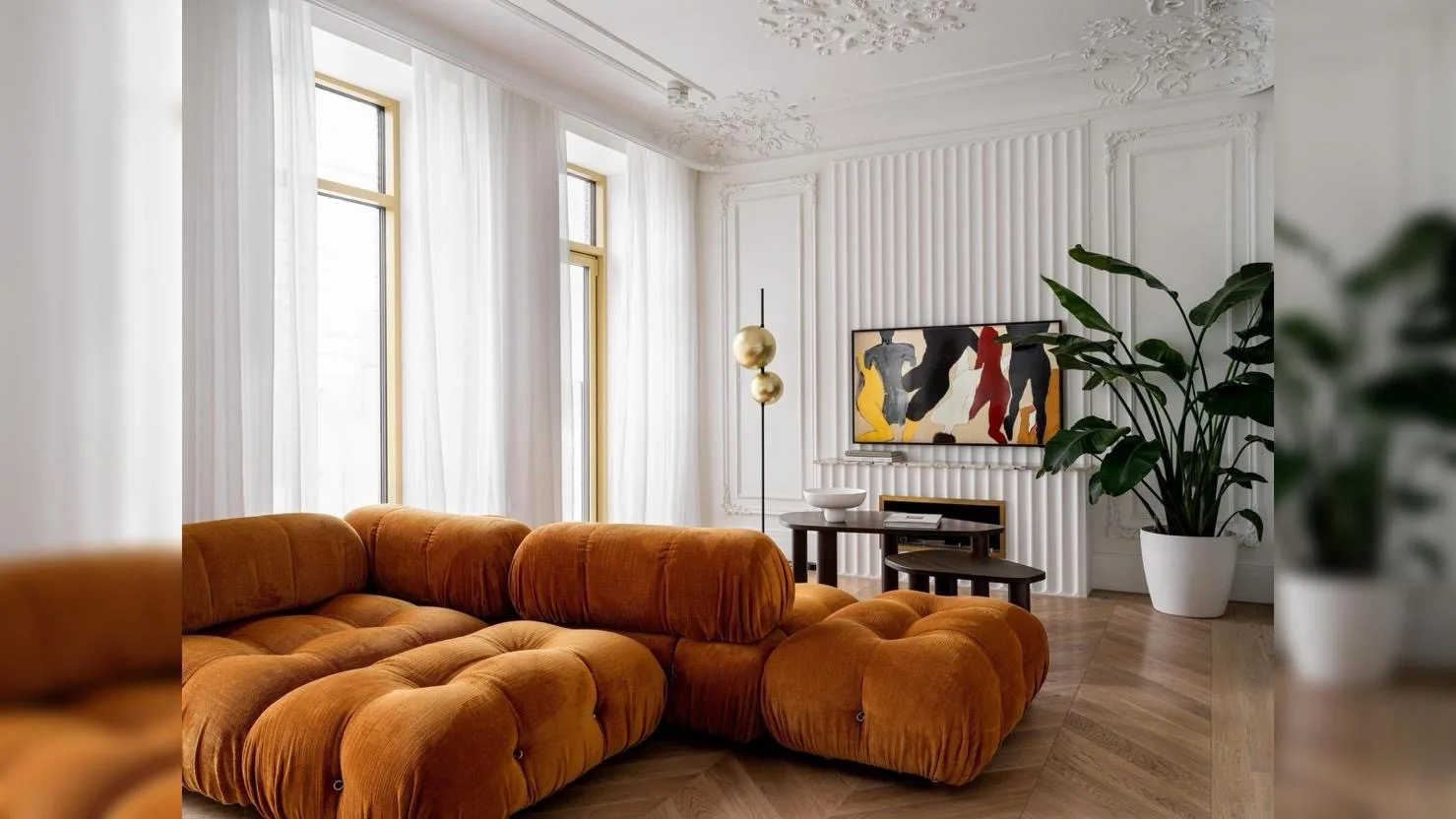 Концептуальной основой проекта стал французский стиль с современным прочтением. Это проявляется в классическом паркете, молдингах на стенах и декоративной лепнине на потолке. Однако интерьер не выглядит традиционным — он наполнен цветом, фактурой и дизайнерскими объектами, которые задают динамику. Одним из самых сложных этапов оказался выбор оттенка паркета. В интерьерах с насыщенной теплой палитрой дерево может давать нежелательный желтый подтон, нарушая баланс. Подбор занял значительное время и превратился в настоящий эксперимент: дизайнеры тестировали различные образцы, сопоставляя их с элементами гардероба заказчицы. В итоге удалось найти решение, которое гармонично вписалось в общую концепцию. Центральным элементом гостиной стал диван Camaleonda от B&B Italia — культовый предмет итальянского дизайна 1970-х годов. Его модульная структура и выразительная форма делают его не только функциональным, но и визуальным акцентом. Вокруг него выстраивается вся композиция пространства. Интерьер насыщен предметами знаковых брендов. Освещение представлено решениями от Oluce и Gubi, мебель — от Desalto и Delo Design. Такие элементы не только подчеркивают статус интерьера, но и делают его узнаваемым, что особенно важно для пространства, которое регулярно попадает в кадр.